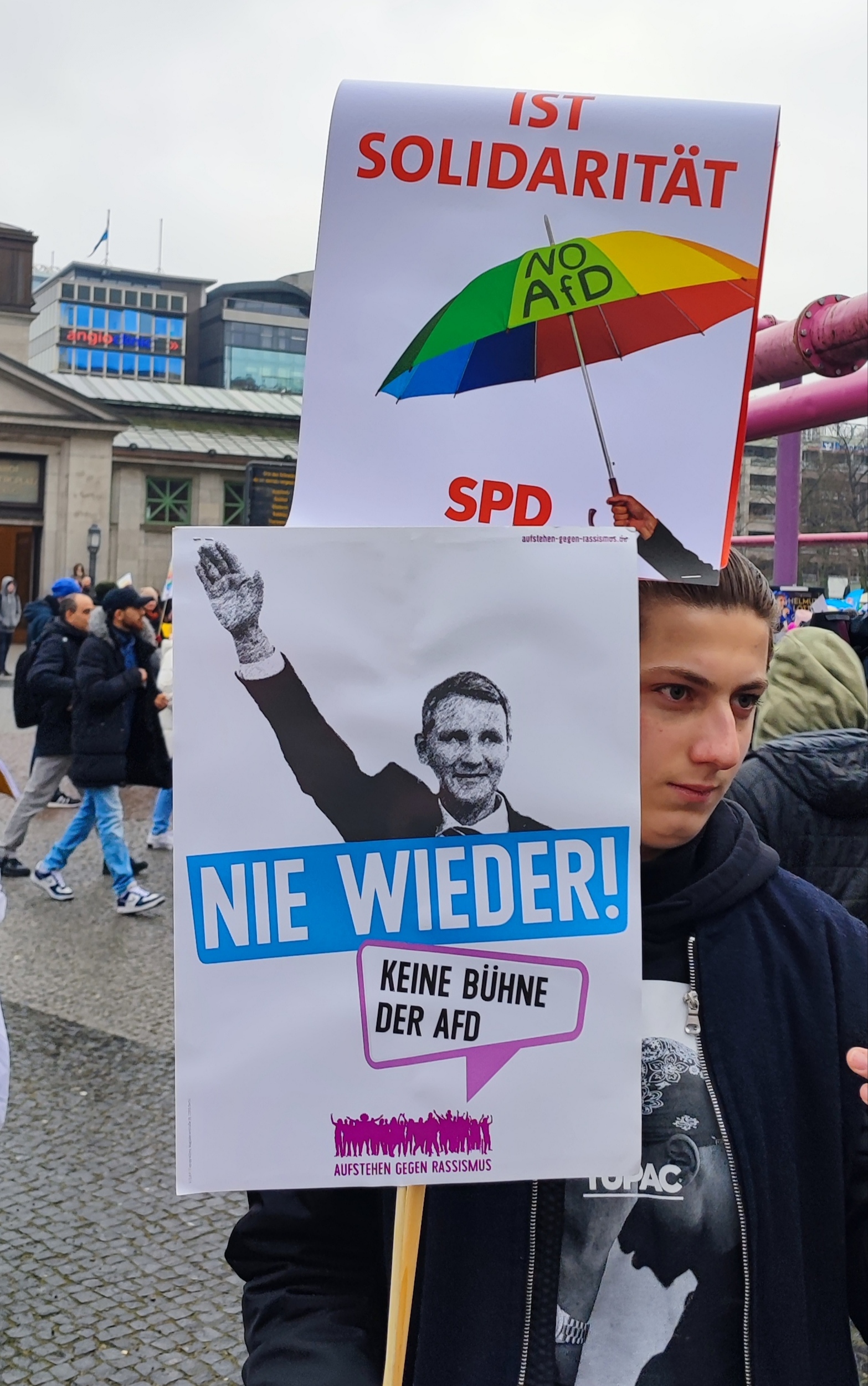 Herzliche willkommen zur Kundgebung von Aufstehen gegen Rassismus gegen den Wahkampfabschluss der AfD. Wir protestieren gegen die AfD, die sich als Anwältin der „kleinen Leute“ aufspielt und immer mehr versucht, sich als Friedenspartei zu inszeniert.