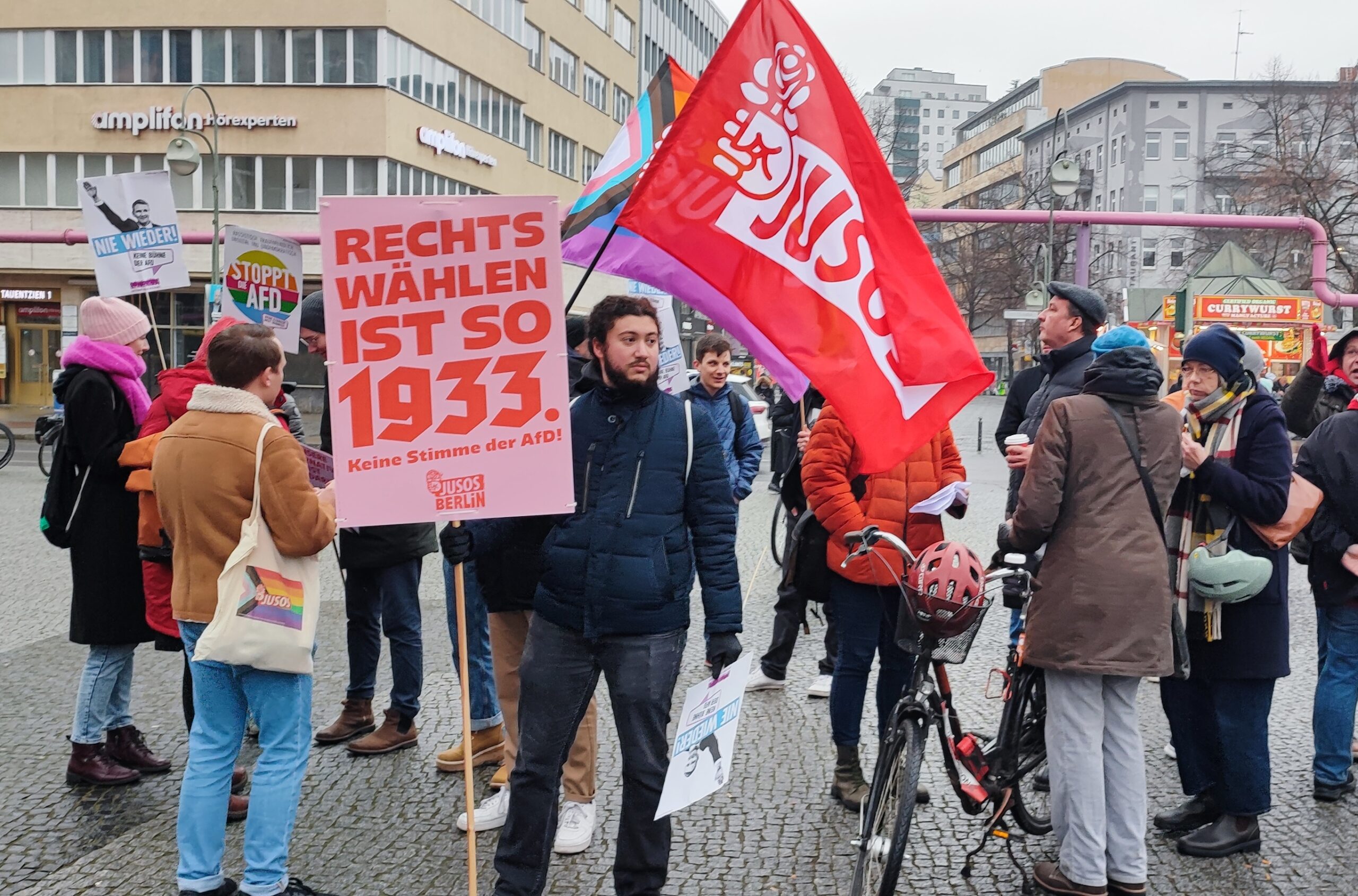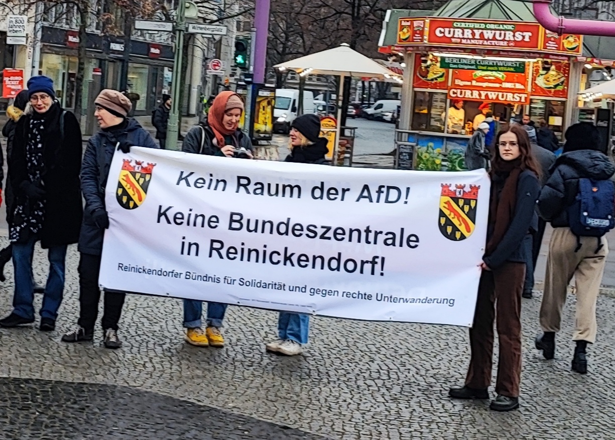 Unter der Losung „Kein Platz für rechte Hetze! Stoppt die AFD“ rief ein Bündnis verschiedener Initiativen am Samstag den 11. Februar auf der Insel des Kudamms zu einer Protestkundgebung auf. Die AFD hatte auf der Randseite des Wittenbergplatzes zu einer Wahlkundgebung eingeladen. Rund um die blauen Schirme der AFD-Stände sammelten sich im Laufe der Zeit etwa 50-70 rechte Aktivist:innen und wohl auch Sympathisant:innen. Auf eine Kundgebung wurde verzichtet. Der antifaschistischen Aktion folgten mindestens ebenso viele Menschen. Mit Transaparenten, Trillerpfeifen und Anti-Nazi-Parolen sezten sie auch ein hörbares Zeichen gegen den Vormarsch der antidemokratischen Kräfte in Berlin. Organisiert wurde die Aktion von einem breiten Bündnis u.a. von Vertreter*innen des LSVD, dem Schöneberger DWE-Kiezteams, der F_ajoc, von Aufstehen gegen Rassismus Berlin, Parteien und dem DGB Tempelhof-Schöneberg. Die Stimmung war trotz des ekligen Wetters gut, wozu auch die engagiert vorgetragenen Reden beitragen konnten. Stellvertretend für diesen Srauß an Beiträgen drucken wir hier die Ansprache von Christine Buchholz, MdB der Partei DIE LINKE und Mitglied des Verteidigungsausschusses, ab. Nunja, immerhin blieb die Neonazi-Partei bei den Wiederholungswahlen einstellig.