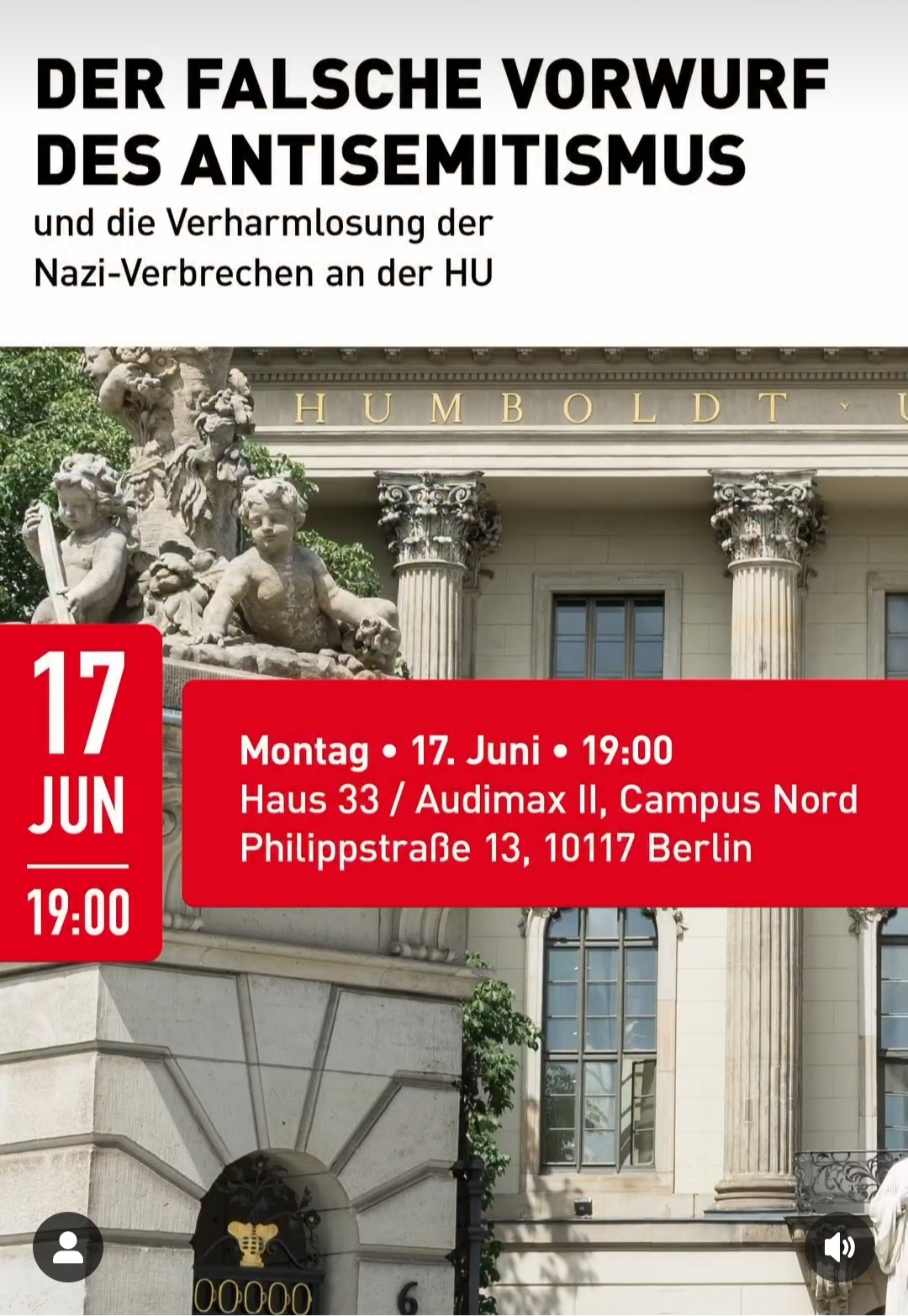 „Während die Unileitung friedliche Studierende als Antisemiten diffamiert und brutal attackieren lässt, weil sie gegen einen Genozid protestieren, stellt sie sich seit Jahren hinter den rechtsradikalen Professor Baberowski, der Hitler bescheinigt,,nicht grausam“ gewesen zu sein und systematisch den Holocaust verharmlost.“