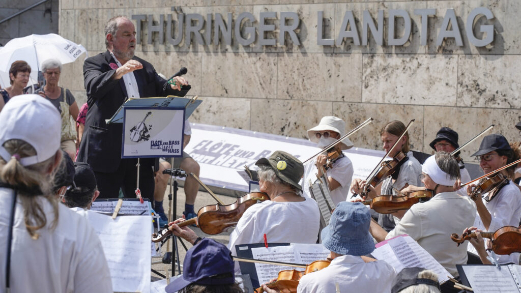 Die “Lebenslaute” gaben gegen diese Demagogie -aber auch gegen die Demagogie der herrschenden Politik- die zahlreiche Vorgaben durch die AfD in praktische Politik umsetzen, Konzerte vor der Gedenkstätte Buchenwald und vor dem Landtag in Erfurt. Näheres zu der Konzertwoche ist hier