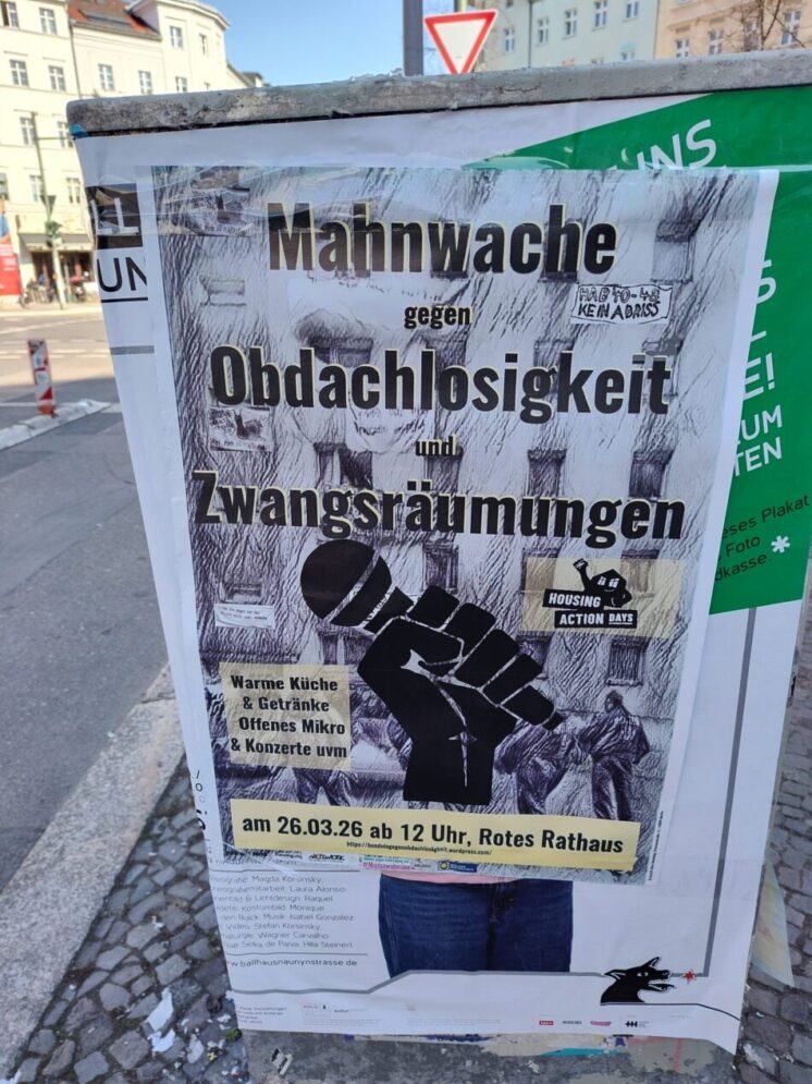 Die Mahnwache am Roten Rathaus soll dieser Gewalt etwas entgegensetzen – unter anderem mit Redebeiträgen, Unterstützungsangeboten, einer Ausstellung und Konzerten. »Das wird richtig groß«, sagt Nicole. In einer digitalen Live-Konferenz will man sich außerdem im Rahmen der Housing Action Days international mit Aktivist*innen austauschen. Schließlich werden voraussichtlich auch einige Menschen die Nacht über vor Ort verbringen. »Wenn man Obdachlosigkeit beenden will, dann muss man endlich mit den Zwangsräumungen aufhören, die immer wieder Obdachlosigkeit schaffen«, sagt Lindner.