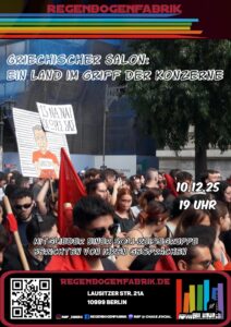 Am 10. Dezember berichten Teilnehmer:innen der Reise vom Oktober 2025 über die politische Situation in Griechenland 10. Dezember 19.00 Uhr, Regenbogenfabrik, Berlin 10999, Lausitzer Straße 21a Im Namen der Veranstalter:innen schreibt Hans Köbrich: „Seit 2012 fahren wir, Kolleginnen und Kollegen aus verschiedenen Gewerkschaften und unterschiedlichen politischen Zusammenhängen, jährlich nach Griechenland und organisieren hierzulande Gegenbesuche und … Weiterlesen