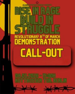 Der Aufruf der Allianz Internationalistischer Feministinnen zum Frauenkampftag wendet sich gegen jegliche Instrumentalisierung des Kampfes für die Befreiung der Frau und betont dessen Unzertrennlicheit vom Kampf gegen Kapitalismus, Imperialismus und Neokolonialismus. Die aktuelle Entwicklung im Nahen Osten bedarf einer konsequenten Antwort. Revolutionäre Demonstration – Im Zorn erheben, im Kampf erbauen 8. März, 15 Uhr, Berlin … Weiterlesen