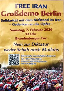 Kundgebung, Samstag 7.Februar, 13 Uhr , Brandenburger Tor , Berlin Am Samstag, dem 7. Februar 2026, findet um 13:00 Uhr in Berlin eine große Demonstration statt, organisiert vom Iranischen Widerstand und Iran Spring, in Solidarität mit dem landesweiten Aufstand im Iran. Die Kundgebung, bekannt als #BerlinFreeIranDemo, findet am Brandenburger Tor statt und bringt Iraner und … Weiterlesen