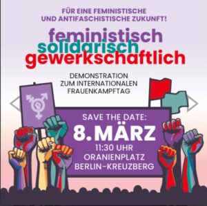 Ein breites Bündnis Berlin ruft alle am Frauenkampftag zur Demonstration auf 8. März, 11:30 Uhr, Berlin Oranienplatz Im Aufruf der IG Metall Bezirk Berlin-Brandenburg-Sachsen heisst es „Der Kampf um Gleichstellung ist auch 2026 noch nicht zu Ende. Deshalb ruft auch dieses Jahr ein breites feministisches, stadtpolitisches und gewerkschaftliches Bündnis am 8. März zur großen Demonstration … Weiterlesen