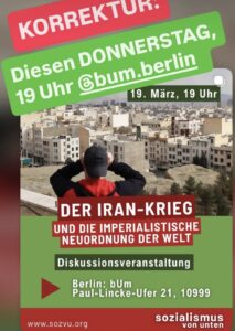 Anfang Februar vor Ausbruch des US-Israelischen Angriffskriegs auf den Iran schrieben wir: „Die komplizierte Lage in Nahost und besonders im Iran hat innerhalb der Linken viele Fragen aufgeworfen. Folgende Postionen sollten aber klar sein: Erstens die Revolte der Menschen gegen blutige Unterdrückung, für soziale und demokratische Rechte ist zu unterstützen. Zweitens sind alle imperialen Einmischungen … Weiterlesen