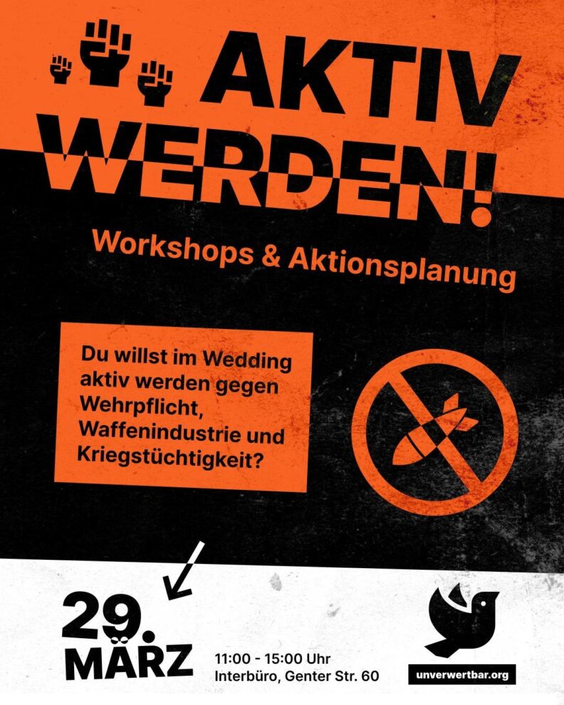 Du willst im Wedding aktiv werden gegen Wehrpflicht, Waffenindustrie und Kriegstüchtigkeit? Dann laden wir dich ein zu unserem Planungstreffen des Netzwerk Wedding. Gemeinsam mit euch wollen wir diskutieren, uns bilden und aktiv werden!