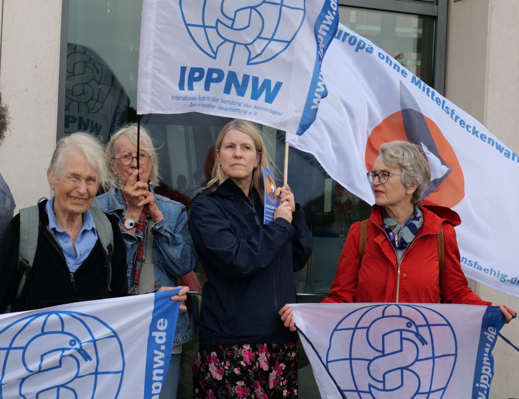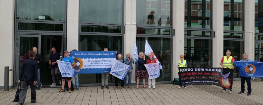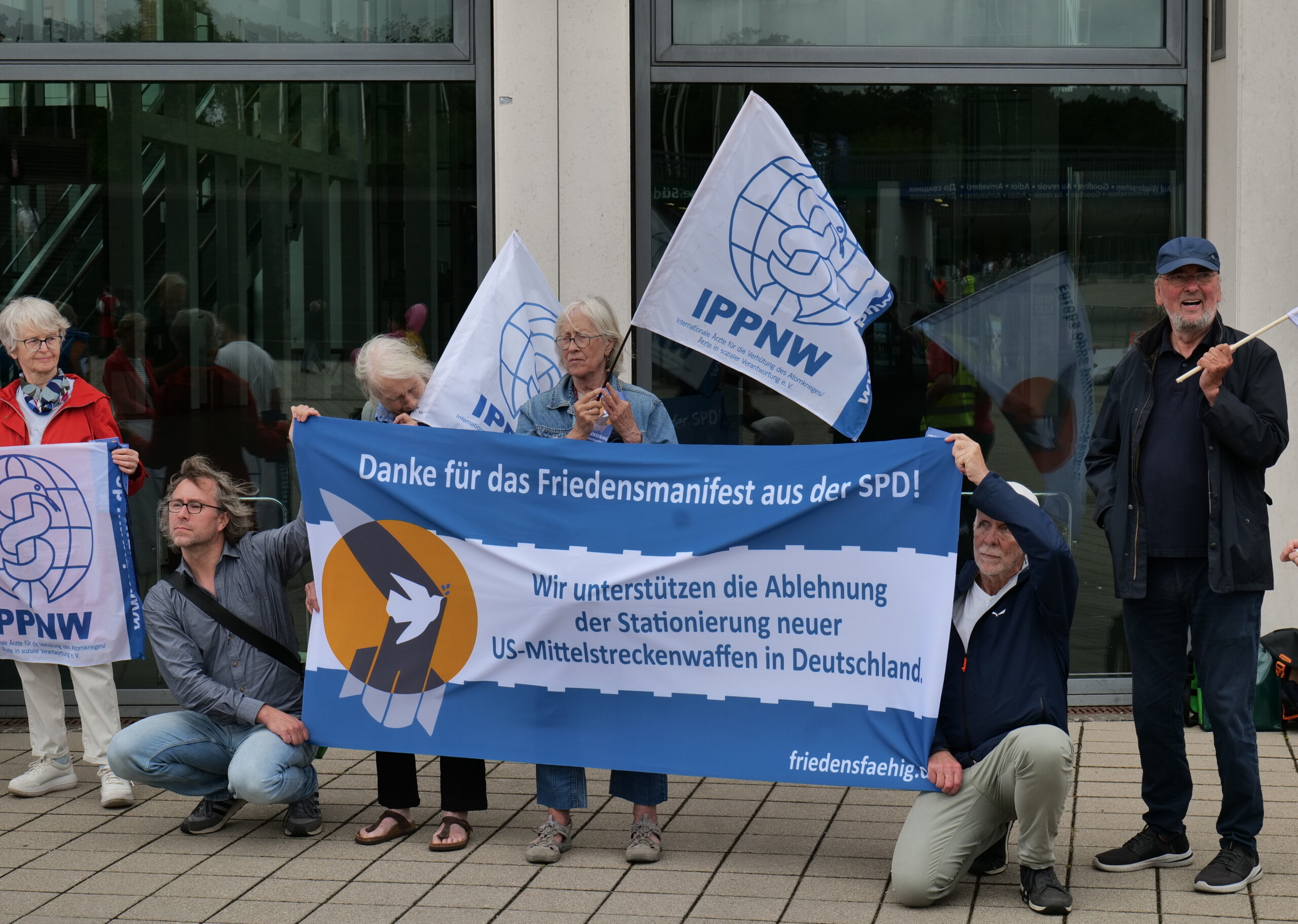 Aktivist*innen der Kampagne „Friedensfähig statt erstschlagfähig. Für ein Europa ohne Mittelstreckenwaffen!“ bedanken sich am Rande des SPD-Parteitages mit einem Banner bei den Unterzeichner*innen des Friedensmanifests aus der SPD. Die Kampagne unterstützt insbesondere die Forderung nach einer Rücknahme der angekündigten Stationierung von US-Mittelstreckenwaffen ab 2026. „Danke für das Friedensmanifest aus der SPD! Wir unterstützen die Ablehnung der Stationierung neuer US-Mittelstreckenraketen in Deutschland“, heißt es auf dem Banner der Aktivist*innen.