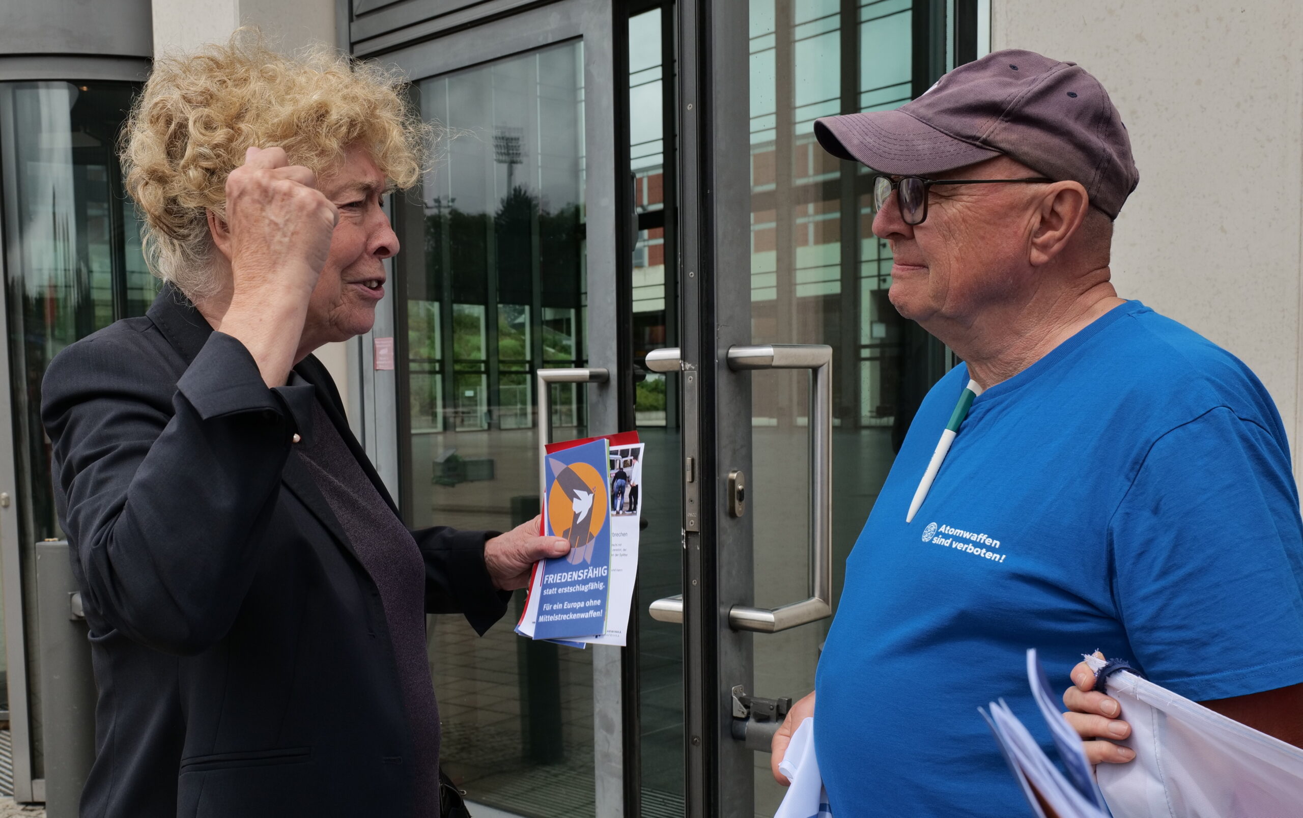 Das Positionspapier von mehr als 100 SPD-nahen Personen zu einer anderen Sicherheits- und Verteidigungspolitik und Gesprächen mit Russland sorgte intern für harsche Kritik. Draußen vor der Tür hofft man, mit einigen Delegierten ins Gespräch zu kommen. Manche Ankommende ignorieren die kleine Gruppe, mit einigen ergeben sich Gespräche auf Augenhöhe.