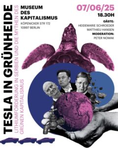 - Tesla in Grünheide – Lithiumförderung in Serbien und die Mythen des grünen Kapitalismus7.6. 18.30 UhrMuseum des Kapitalismus, Köpenickerstraße 172, 10997 Berlin Tesla in Grünheide – Lithiumförderung in Serbien und die Mythen desgrünen Kapitalismus Veranstaltung mit Heidemarie Schroeder, Autorin des Buches „Eine Gigafabrik in Grünheide“ und Matthieu Hansen, Regisseur desFilms „Outsourced: Import Resources, export pollution“ über dieLithium-Ausbeutung in Serbien, Moderation Peter Nowak (Journalist) Veranstalter u. a Tesla den … Weiterlesen
