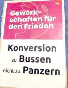 - Auto: Krise und Konversion – Klima oder RüstungZeitenwende allerorten: Autoarbeiter in der Krise – Frieden in der Krise – Klima in der Krise! Zehntausende Arbeitsplätze sollen weg. Die Staatsschulden steigen ins Unermessliche. Die Lenker von Wirtschaft und Staat verordnen Umrüstung zur Aufrüstung, Abschied vomKlimaschutz, Wettlauf um Rohstoffe – und – mehr und länger arbeiten. Das wollen wir zum Thema machen, und zwar … Weiterlesen