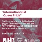 - Stellungnahmen zur Polizeigewalt gegen Demonstrierende auf der „INTERNATIONALIST QUEER PRIDE“-Demonstration in BerlinZur Polizeigewalt am 26 Juli auf dem Berliner alternativen CSD „Internationalist Queer Pride“ haben ALLIANCE OF INTERNATIONALIST FEMINISTS, PA-ALLIES und Arrest Press Unit eine Erklärung verfasst, die wir hier neben weiteren Kommentaren veröffentlichen: Am 26. Juli 2025 gingen etwa fünfzehntausend Menschen in Berlin auf die Straẞe, um am Internationalist Queer Pride teilzunehmen – einer Demonstration, … Weiterlesen