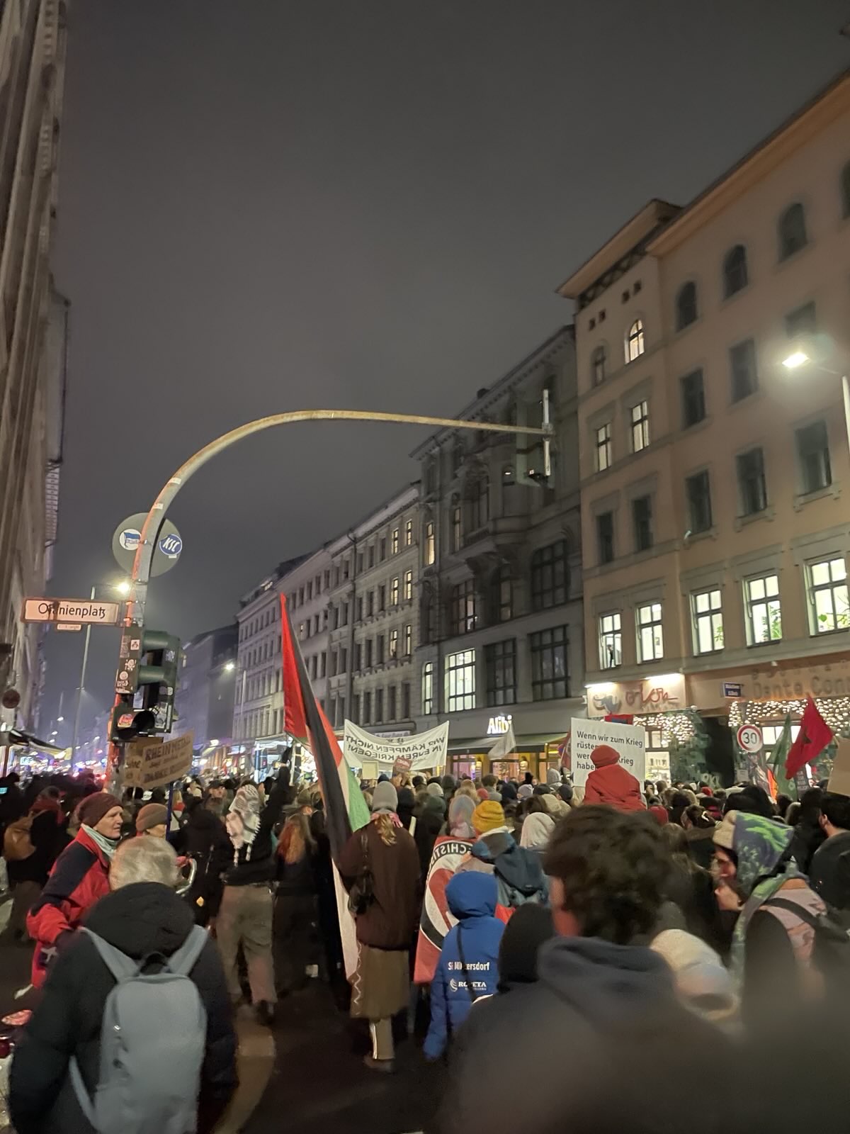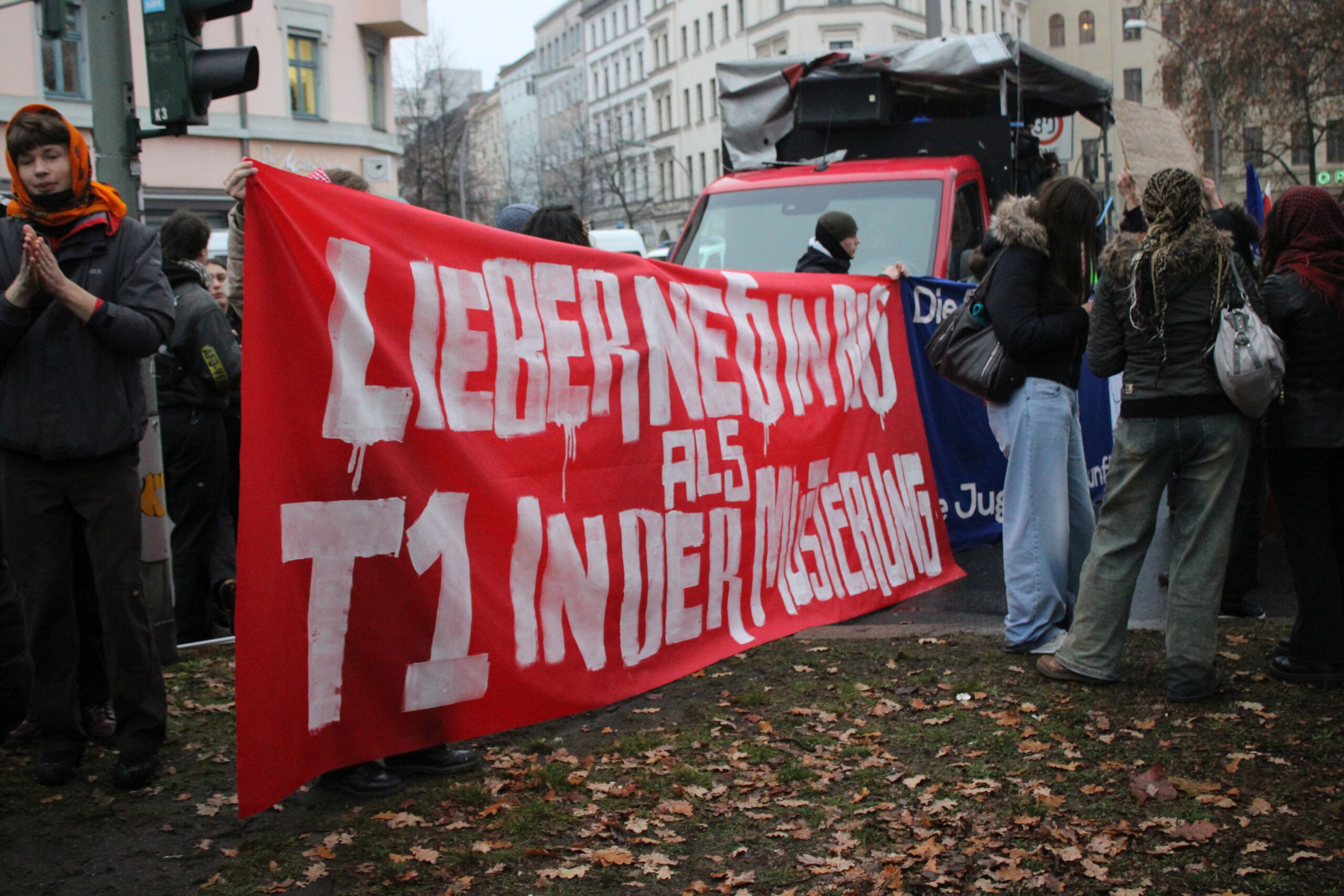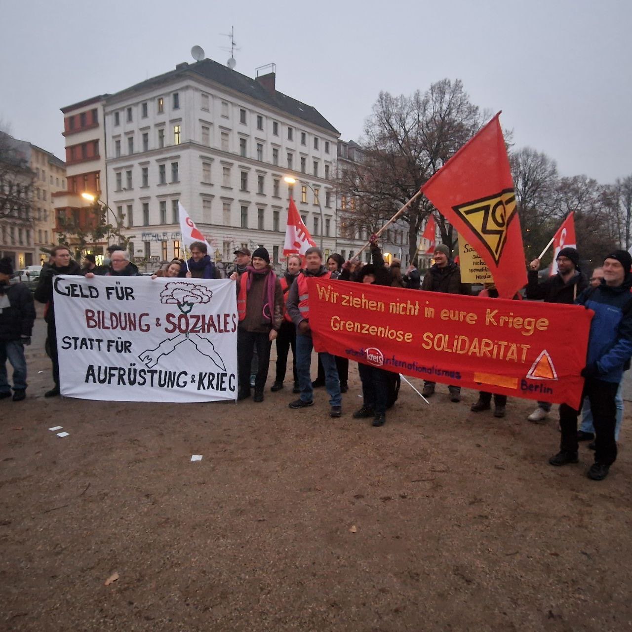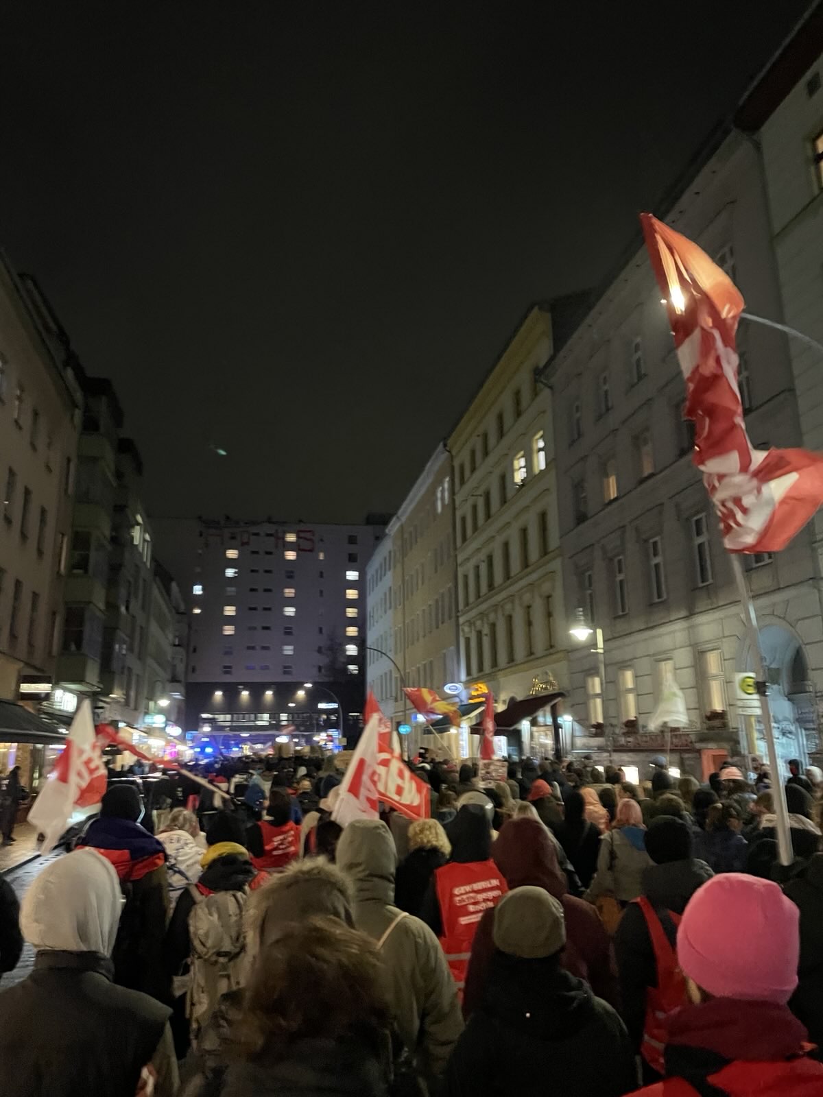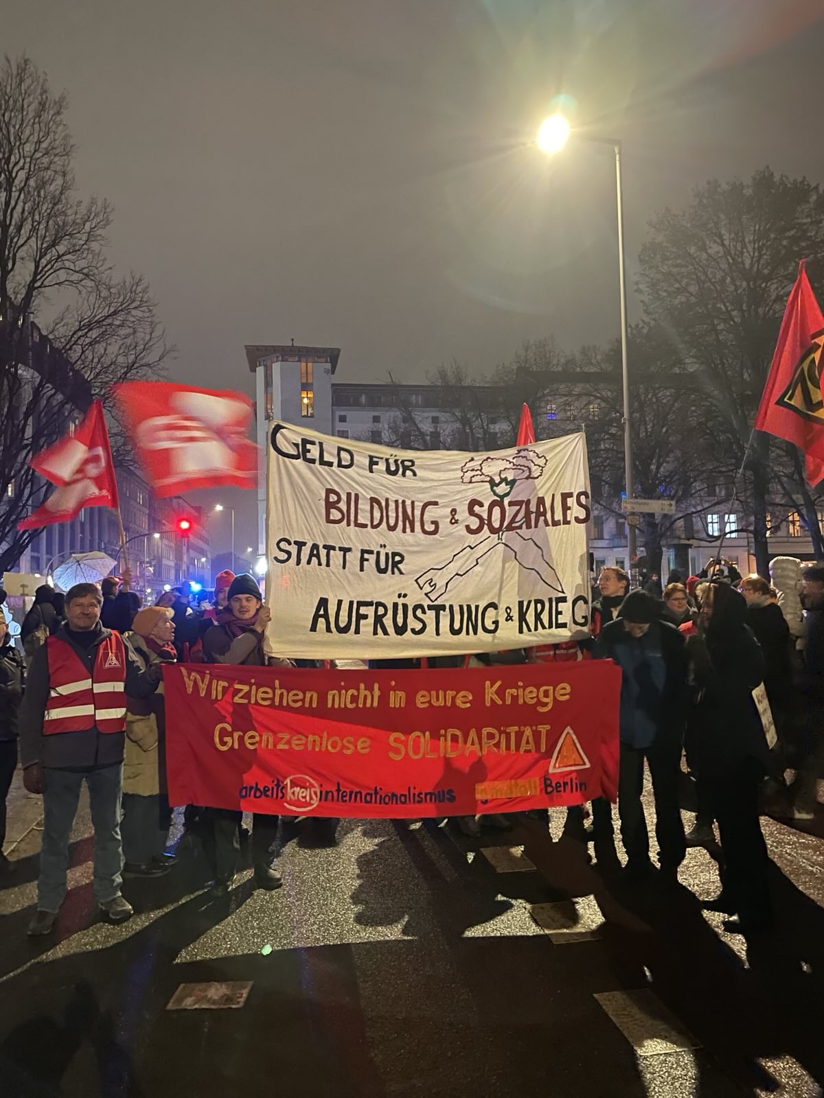 Vom Oranienplatz ging es, nach einer etwas langen Zwischenversammlung, weiter Richtung Neukölln. Der Demozug wurde vom harten Kern der Schüler:innen angeführt, denen die Kälte nichts anzuhaben schien. Durchgehend von klassenkämpferischen Parolen begleitet, ging es am Kottbusser Tor vorbei. Vom Dach des „Zentrum Kreuzberg“ wurde die Demo mit einem Bannerdrop begrüßt. Wer in den dunklen Nachthimmel über sich schaute, erkannte in großen Lettern: „Nein zur Wehrpflicht“ über der Straße, während unten die passenden Sprechchöre angestimmt wurden. Einige Passant:innen signalisierten ihre Zustimmung, andere spähten interessiert nach den Plakaten. Am Hermannplatz gab es eine weitere Verzögerung und die Demo schmolz nun wirklich auf den harten Kern, der am Ende eines langen Streiktages erfolgreich das Rathaus Neukölln erreichte.