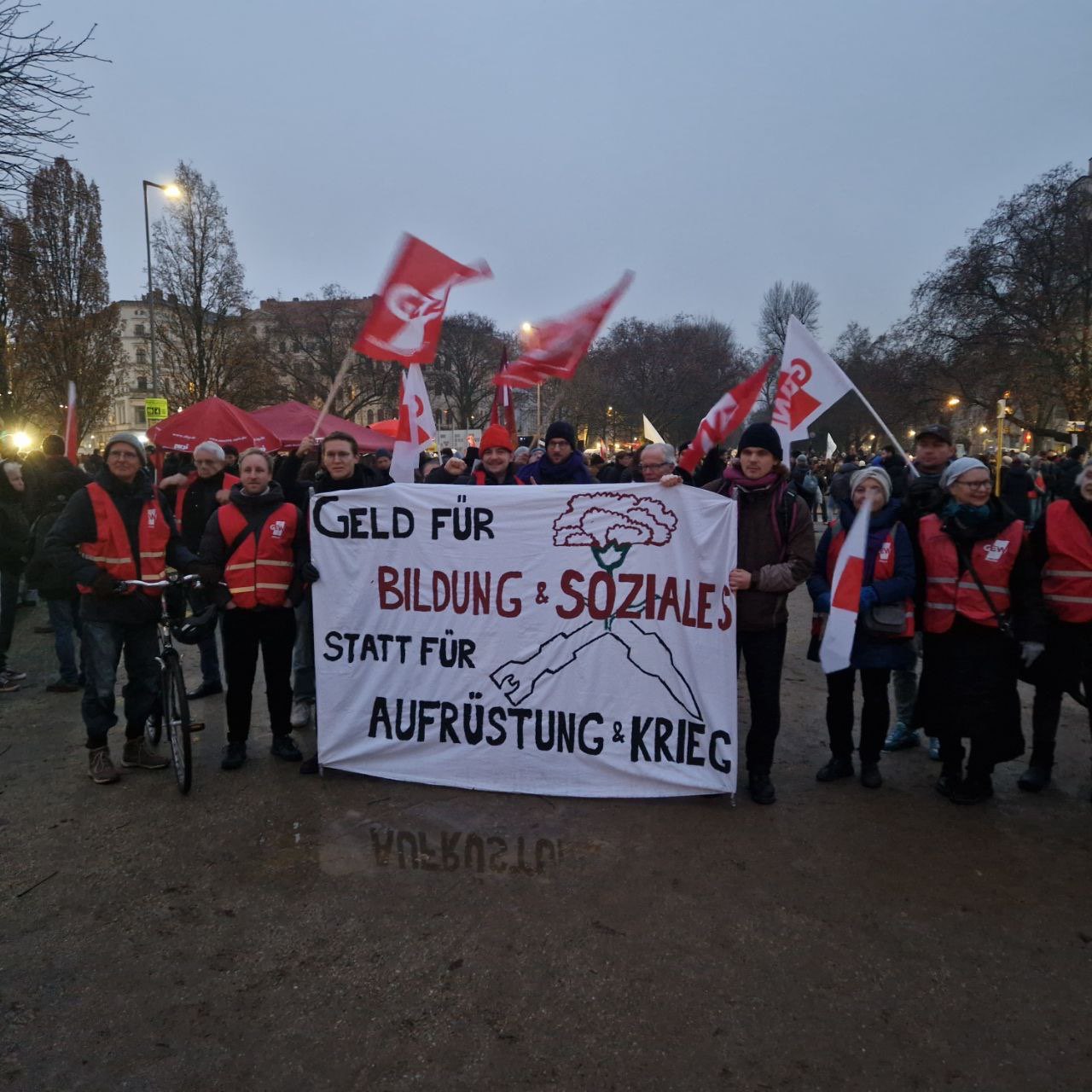 Die Auseinandersetzung hat gerade erst begonnen. Noch betonen regierende Sozialdemokraten, wie willkommen ihnen die demokratischen Proteste seien. Doch das Süßholzraspeln von Pistorius und SPD dürfte angesichts des scharf eingeschlagenen Kriegskurses kaum verfangen. Ebensowenig wie die Flucht in die Rüstungsproduktion Beschäftigung und Lebensstandard sichern werden, sondern unter dem Strich zur Bedrohung von uns allen werden. Der Wind wird also wohl schon bald sehr viel rauer werden. Dann kommt es auf die Basis der Gewerkschaften an. Die sollte schon jetzt ihre Führungen in die Pflicht nehmen. Der DGB muss sich endlich klar und kompromisslos an die Seite der Lohnabhängigen stellen und den Realitäten ins Auge blicken. Mit dieser Regierung und mit dieser SPD gibt es keine Augenhöhe. Nur Streiks werden etwas bewirken. Massenaktionen der Arbeiter:innen können bei den Kapitalisten, die immer offener eine AfD Regierungsbeteiligung vorantreiben, zu einem Umdenken führen. Wenn die deutschen Gewerkschaften sich nicht endlich entschieden auf Generalstreiks vorbereiten, laufen sie Gefahr damit wieder einmal zu spät zu kommen.