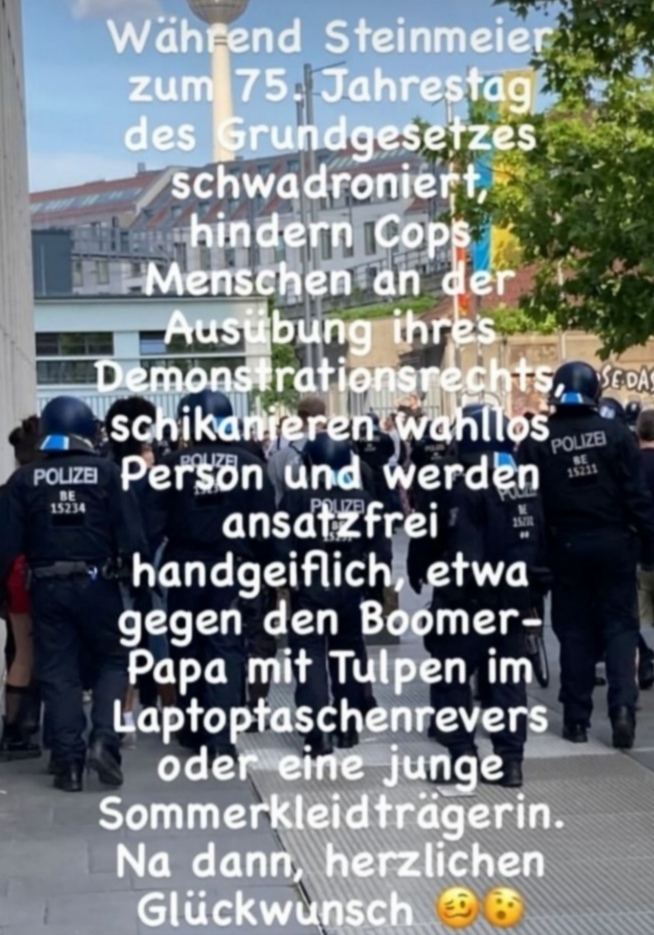 „Senat und Polizei in Berlin kennen nur die Sprache der Härte“ titelte die Berliner Zeitung. [2]Nach Gewalt gegen Journalisten: Senat und Polizei in Berlin kennen nur die Sprache der Härte (berliner-zeitung.de Einer ihrer Journalisten war bei der Erstürmung der UNI-Räume von der Polizei massiv behindert, festgenommen und misshandelt worden. [3]der Betroffene Journalist berichtet: Zweimal habe ihm der Polizist mit Fäusten ins Gesicht geschlagen, sagt Rosaslanda am Freitag. Und ihn dann über mehrere Stunden mit Handschellen fixiert. In … Continue reading Sein Video enttarnte die offensichtlichen Lügen der Polizei, die sie vorher über die Vorgänge verbreitet hatte. Das Handeln der Polizei war in mehrfacher Hinsicht strafbar und stellte einen schwerwiegenden Eingriff in die grundfrechtlich geschützte Pressefreiheit dar.