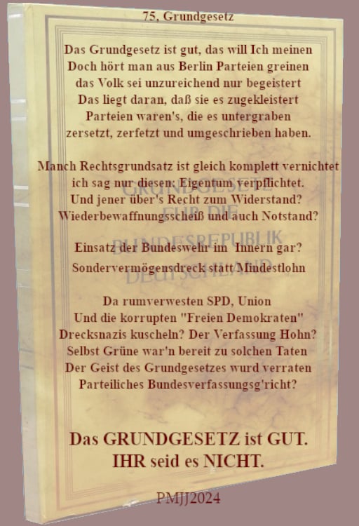 „Am 23. Mai 1949 trat das Grundgesetz in Kraft, heute vor 75 Jahren. Damals schrieben die Väter und Mütter nicht nur auf, dass die Würde des Menschen unantastbar und Männer und Frauen gleichberechtigt sind, sie stellten auch fest, dass Eigentum verpflichtet. Wer ein großes Vermögen besitzt, ist folglich laut Grundgesetz dazu verpflichtet verantwortungsbewusst damit umzugehen und es zum Wohl der Allgemeinheit zu nutzen. Das GG schreibt also nicht Kapitalismus und Gewinnmaximierung vor, wie oft irrtümlich angenommen. 1949 war man sich einig, dass von deutschem Boden nie wieder Krieg ausgehen darf. Man konnte sich ganz sicher nicht vorstellen, dass die Bundeswehr – 1955 zur Landesverteidigung gegründet – heute weltweit eingesetzt wird, um Wirtschaftsinteressen und die Dominanz des Westens durchzusetzen. Das Grundgesetz ist in vielen Bereichen nach dem Vorbild der Weimarer Verfassung entstanden. Die Weimarer Verfassung war bis 1945 in Kraft und hat den Naziterror nicht verhindert. Das beweist, dass es nicht reicht, ein GG zu haben, es muss mit Leben erfüllt und von der Zivilgesellschaft akzeptiert und verteidigt werden. Wer heute verfolgt, wie mit Andersdenkenden von Politik und Medien umgegangen wird (Thema Corona, Ukraine, Israel) der ist in großer Sorge um den Fortbestand demokratischer Grundwerte.“