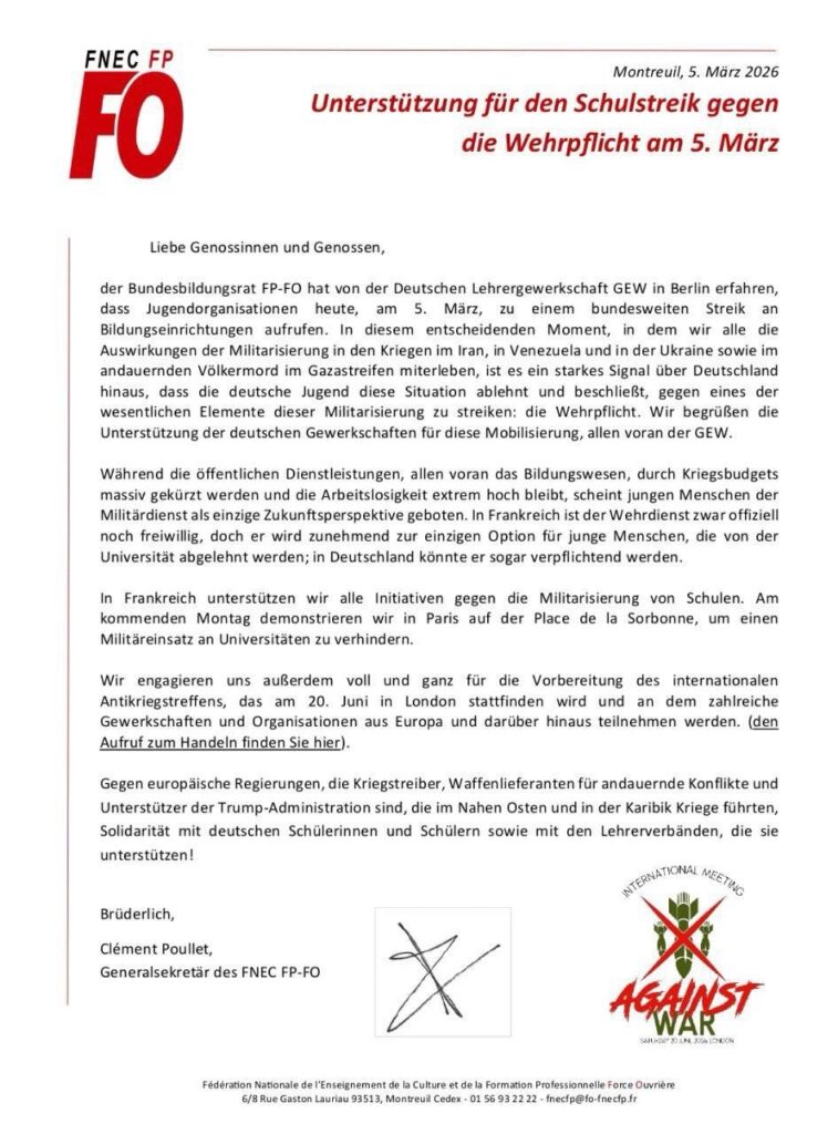 Die Regierenden müssen zum Umdenken gezwungen werden. Es ist ein ermutigendes Zeichen, dass die Schüler:innen eine bundesweite Streikbewegung auf die Beine stellen konnten. Doch das kann nur der Anfang sein. Hoffnung macht, dass sich auch weltweit viele Jugendverbände mit den Schüler:innen in Deutschland solidarisierten. In Italien kam es zu Solidaritätsstreiks von Schüler:innen. Aus Frankreich gab es unter anderem eine Solidaritätserklärung der Bildungsgewerkschaft FNEC FP-FO, die die Militarisierung des Bildungswesens in einen geopolitischen Kontext setzt. Solche klaren Worte lassen die deutschen Gewerkschaften in der Summe nach wie vor vermissen.