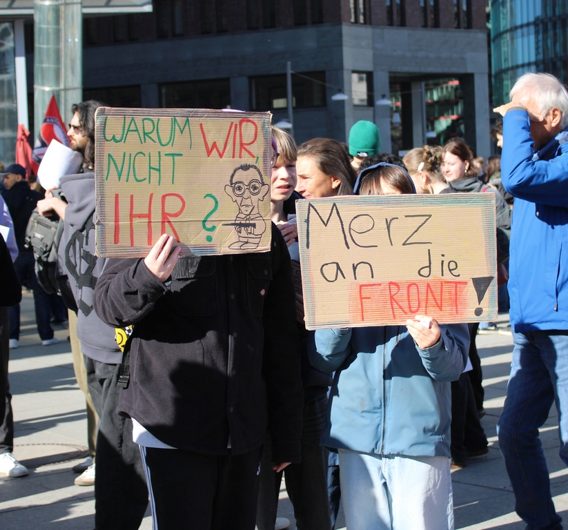 Die Schüler:innen machten auf Transparenten und in ihren Reden deutlich, dass sie einen Zwangsdienst an der Waffe ablehnen. Immer wieder stimmten sie die Parolen „Nie wieder Wehrpflicht“ und „Die Reichen wollen Krieg, die Jugend eine Zukunft!“ an. Die Demonstrationen waren wie schon im Dezember klar internationalistisch geprägt. In einigen Städten gab es Berichte über Repressionen. So sollen in Stuttgart und Frankfurt beispielsweise Schüler:innen in der Schule eingeschlossen worden sein, um nicht am Schulstreik teilzunehmen. Solche Maßnahmen dürften rechtswidrig sein und sind scharf zu verurteilen. In München sollen Schüler:innen von der Polizei in ihre Schulen zurückgezwungen worden sein. Eine Gesellschaft, die stets betont wie wichtig ihr demokratische Werte sind, sollte die Meinungs- und Versammlungsfreiheit wertschätzen und auf solche Repressalien gegenüber der Jugend verzichten. Die Berliner Polizei fiel mit bemerkenswertem Verfolgungseifer gegen Plakate auf, die sie als beleidigend gegenüber Bundeskanzler Merz einstufte. [1]beleidigendes-merz-plakat