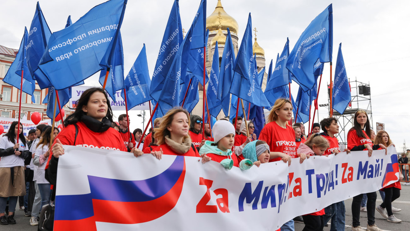 Bild: Gewerkschaftlicher Aufmarsch der FNPR am 1.Mai 2023. Moskow Times.