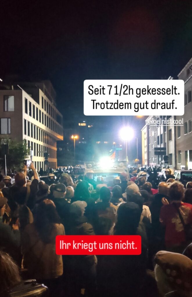 Schließlich wurde der Block stundenlang rechtswidrig eingekesselt. Der Lautsprecherwagen wird gestürmt und durchsucht. Währenddessen werden immer mehr Polizeieinheiten herangezogen. Auch ein Wasserwerfer und Räumpanzer wurden vorgefahren. Stosstrupps der Polizei dringen Immer wieder gewaltsam zu den Eingekesselten vor und ziehen willkürlich einzelne Personen heraus. Sie führen regelrecht „Krieg gegen Kriegsgegner„! Diese aber harren aus und lassen sich nicht spalten. Kölner:innen kommen und zeigen sich solidarisch.