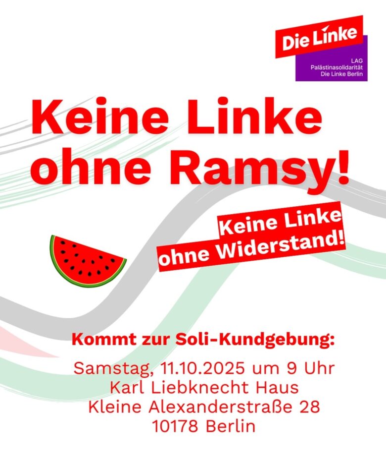Unser Genosse Ramsis Kilani wurde Ende 2024 aus unserer Partei Die Linke ausgeschlossen. Der Grund: Er würde gegen die Grundsätze der Partei verstoẞen. Der Ausschluss bezieht sich auf die „Zweistaatenlösung“ und das „Existenzrechts Israels“. Am 11. Oktober 2025 wird sein Parteiausschluss vor dem Bundesschiedsgericht erneut verhandelt.