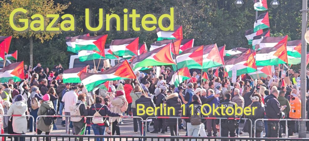 Gaza United ist eine Graswurzelbewegung. Hinter ihr steht weder die Orgnaisationsmacht noch hat sie die finanziellen Möglichkeiten der großen deutschen NGOs und auch linken Parteien. Dennoch strömten auch dieses Mal die Menschen aus allen Ritzen der Gesellschaft herbei, allen Widrigkeiten zum Trotz. Offiziell sollen es 15 bis über 20 Tausend gewesen sein, nach Aussagen der Veranstalter 60 Tausend Teilnehmer. Wir können die Zahlen nicht verifizieren. Für die erste Zusammenkunft von Gaza United im Juni lautete die offizielle Zahl 15 Tausend, später nach elektronischer Auswertung des Videomaterials konnten ca. 70 bis 80 tausend verifiziert werden. Auf alle Fälle ein riesiger Erfolg.
