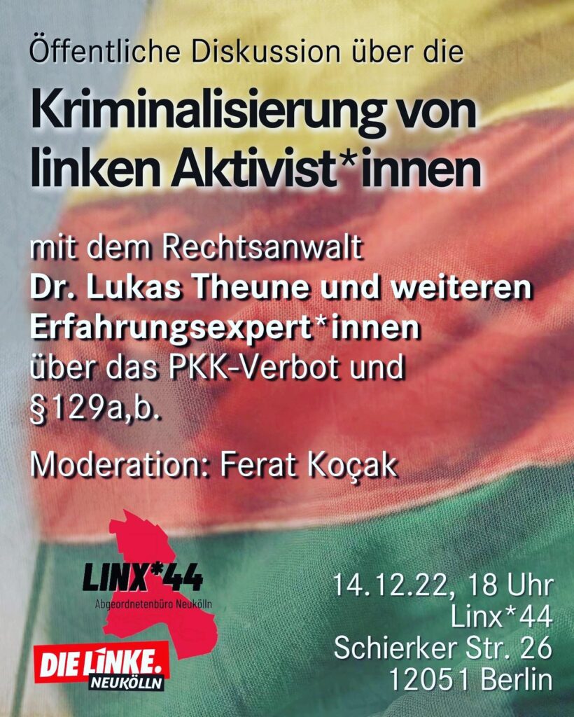 Am 14.12.22 findet unter Moderation des Abgeordneten Ferat Kocak (Die LINKE Neukölln) eine Veranstaltung zum Thema Repression gegen die kurdische Bewegung und ihrer Vertreter in Deutschland statt. Ort Linx* 44, Schierker Str. 26, 12051 Berlin.