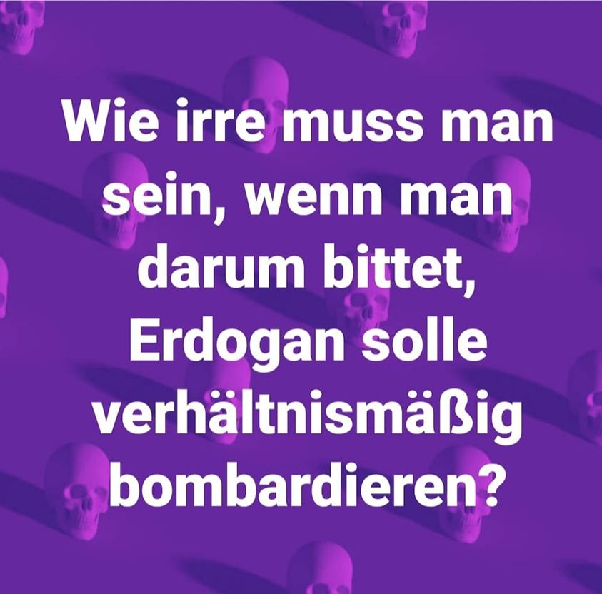 Natoland Türkei bedroht und attackiert seit Jahren die selbstverwalteten demokratischen kurdisch-multiethnischen Regionen von Nordsyrien und die Kurdenpartei PKK im Norden Iraks. Zuletzt kam es diesen November wieder zu offenen völkerrechtswidrigen militärischen Angriffen. Erneut wurden etliche Zivilisten in Rojava verletzt oder kamen ums Leben. Wichtige zivile Infrastrukturen wurden weiter massiv beschädigt und zerstört.