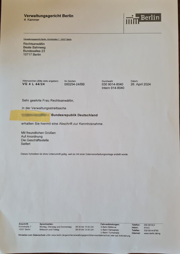 Rechtsanwältin Beate Bahnweg gab vor wenigen Stunden auf ihrer Facebook-Seite folgende Erklärung ab: “Die Bundesregierung bekommt mit der #Kriegswaffenlieferung an #Israel aller Voraussicht nach ein gerichtliches Problem vor dem Berliner Verwaltungsgericht. In unserer #Klage/Eilantrag VG 4 L 44/24 gegen die Waffenlieferungen nach Israel hat das Verwaltungsgericht am Freitag den 26.04.2024 gegen die Bundesregierung (Antraggegnerin) die folgenden Aufforderungen verfügt. Besonders wichtig ist, der letzten Satz des Gerichtes. Sofern Deutschland bis zur Eilentscheidung in dieser Klage vom 19.02.2024 weiter Kriegswaffen an Israel liefert, wird ein Zwischenbeschluss angedroht, der dies untersagt.”