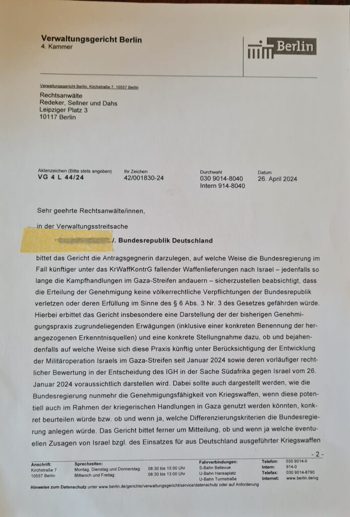 Diese Aufforderung an die Bundesregierung steht wiederum im Zusammenhang mit einer Klage vom 19.02.2024. Die Klage hat das Ziel, in einer Eilentscheidung die Lieferung von weiteren Kriegswaffen von Deutschland an Israel zu verhindern.