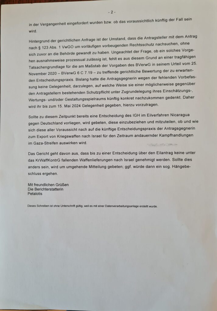 Das Gericht geht davon aus, dass bis zu einer Entscheidung über den Eilantrag keine unter das KrWaffKontrG fallenden Waffenlieferungen nach Israel genehmigt werden. Sollte dies anders sein, wird um umgehende Mitteilung gebeten; ggf. würde dann ein sog. Hängebeschluss ergehen.