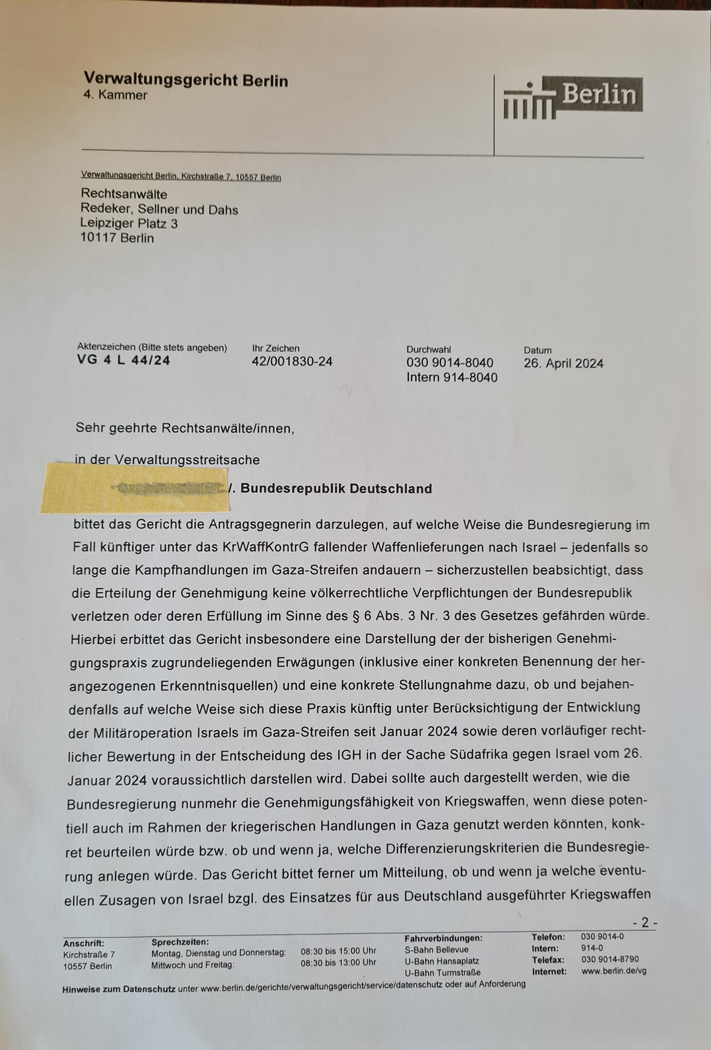 Rechtsanwältin Beate Bahnweg gab vor wenigen Stunden auf ihrer Facebook-Seite folgende Erklärung ab: “Die Bundesregierung bekommt mit der #Kriegswaffenlieferung an #Israel aller Voraussicht nach ein gerichtliches Problem vor dem Berliner Verwaltungsgericht. In unserer #Klage/Eilantrag VG 4 L 44/24 gegen die Waffenlieferungen nach Israel hat das Verwaltungsgericht am Freitag den 26.04.2024 gegen die Bundesregierung (Antraggegnerin) die folgenden Aufforderungen verfügt. Besonders wichtig ist, der letzten Satz des Gerichtes. Sofern Deutschland bis zur Eilentscheidung in dieser Klage vom 19.02.2024 weiter Kriegswaffen an Israel liefert, wird ein Zwischenbeschluss angedroht, der dies untersagt.”