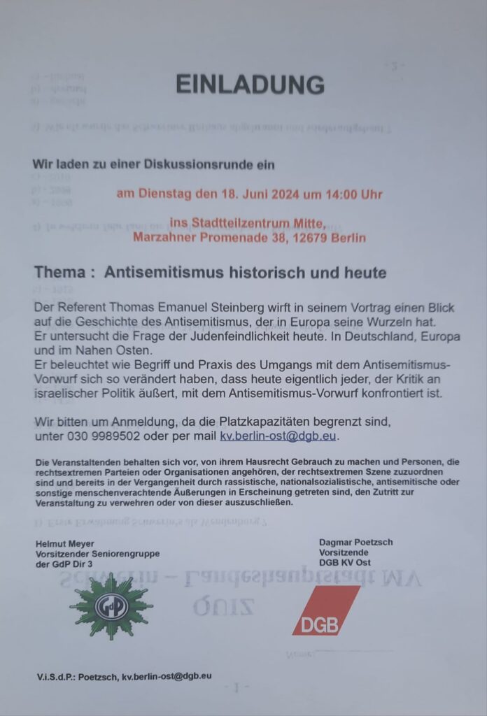 „Der Referent Thomas Emanuel Steinberg wirft in seinem Vortrag einen Blick auf die Geschichte des Antisemitismus, der in Europa seine Wurzeln hat. Er untersucht die Frage der Judenfeindlichkeit heute. In Deutschland, Europa und im Nahen Osten. Er beleuchtet wie Begriff und Praxis des Umgangs mit dem AntisemitismusVorwurf sich so verändert haben, dass heute eigentlich jeder, der Kritik an israelischer Politik äußert, mit dem Antisemitismus-Vorwurf konfrontiert ist.“