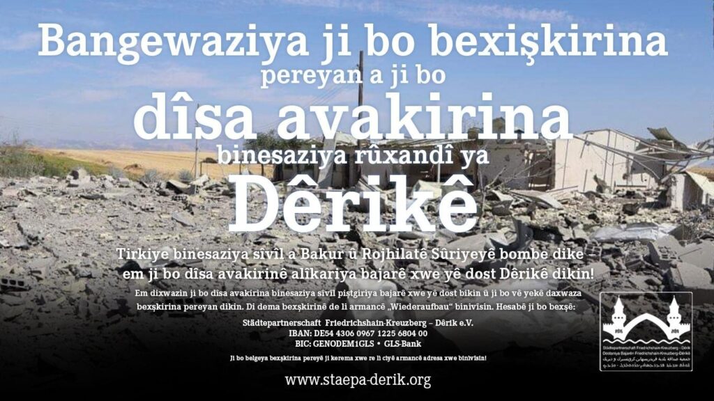 Anfang Oktober berichteten wir „Natoland Türkei schlägt erneut mit brutaler Gewalt gegen die selbstverwalteten demokratischen kurdischen Gebiete im Norden Syriens zu. Mit von Deutschland und den USA gelieferten Waffen. Offener Bruch des Völkerrechts. Ein ganzes Krankenhaus vernichtet. Für die Zivilbevölkerung überlebenswichtige und auch ökologische Infrastrukturen vollkommen zerstört.“ [1] https://gewerkschaftliche-linke-berlin.de/hilferuf-tuerkei-bombardiert-erneut-die-partnerstadt-derik-von-friedrichshain-kreuzberg/ Wir publizierten den Hilferuf der Städtepartnerschaft Friedrichshain-Kreuzberg – Dêrik e.V. .