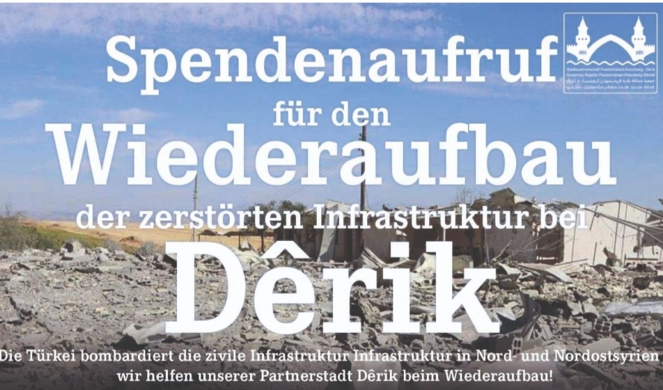 Anfang Oktober berichteten wir „Natoland Türkei schlägt erneut mit brutaler Gewalt gegen die selbstverwalteten demokratischen kurdischen Gebiete im Norden Syriens zu. Mit von Deutschland und den USA gelieferten Waffen. Offener Bruch des Völkerrechts. Ein ganzes Krankenhaus vernichtet. Für die Zivilbevölkerung überlebenswichtige und auch ökologische Infrastrukturen vollkommen zerstört.“ [1] https://gewerkschaftliche-linke-berlin.de/hilferuf-tuerkei-bombardiert-erneut-die-partnerstadt-derik-von-friedrichshain-kreuzberg/ Wir publizierten den Hilferuf der Städtepartnerschaft Friedrichshain-Kreuzberg – Dêrik e.V. .