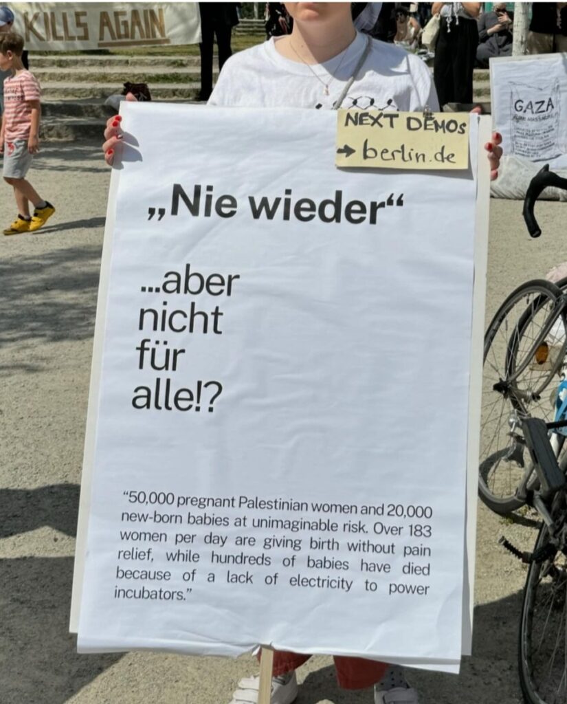 Am Wochende fanden in Berlin Trauerbekundungen für die Opfer in GAZA statt. An der Neuen Wache wurden die 15 000 getöteten Kinder jedes einzeln mit Verlesung seines Namens gewürdigt. Am Mauerpark wurde mit einem Flashmob aller Opfer gedacht. Tausende Passanten waren beeindruckt und zeigten Empathie. „Nie wieder“ ..aber nicht für alle? Diese verquere Logik der deutschen Eliten löst im Ausland, aber auch im Inland zunehmend Kopfschütteln aus „Alle Menschen sind gleich“. Das versteht jeder. Es sei denn, er /sie ist offene oder versteckte Rassist:in.