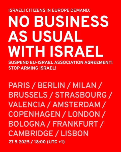 Aussetzung des Assoziierungsabkommens zwischen der EU und Israel! Stoppt die Bewaffnung Israels! Als israelische Bürger in Europa beobachten wir mit gebrochenem Herzen und unendlicher Wut, wie die israelische Armee dem Gazastreifen und seiner Bevölkerung beispiellose Zerstörung zufügt, wie die israelische Gesellschaft in Faschismus und weitverbreitete Entmenschlichung abdriftet und wie unsere Regierung einen Völkermord begeht, der auf die Vernichtung der palästinensischen Gemeinschaft abzielt.