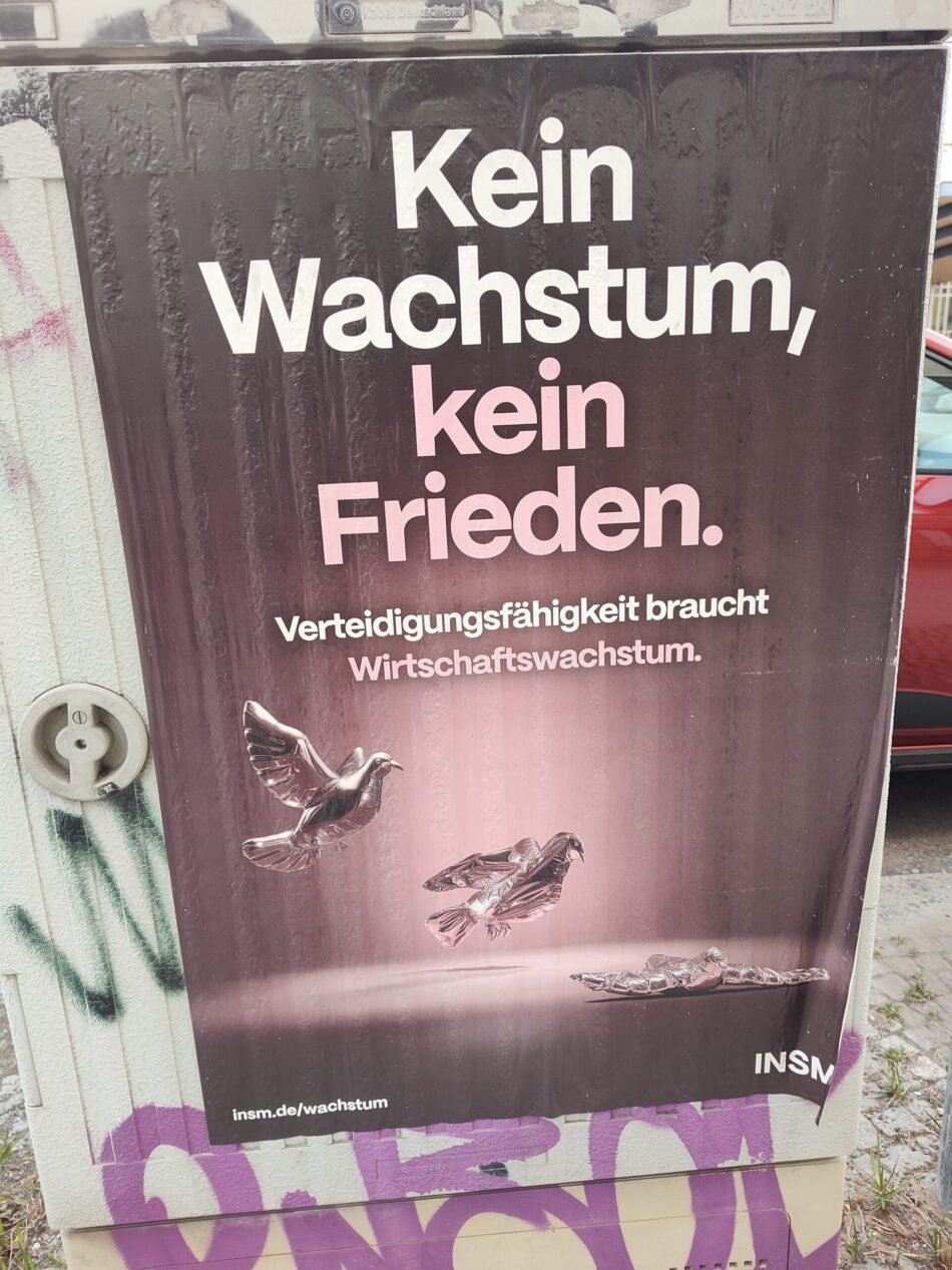Titelbild: Wild verklebtes Plakat der „Initiative Neue Soziale Marktwirtschaft“, Arbeitgeberlobbyorganisation von Gesamtmetall. Klare Worte: Wenn das Wachstum strauchelt, ist der Krieg nicht weit. Foto: Jochen Gester