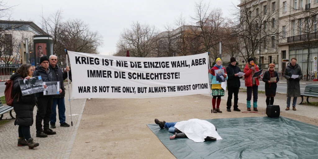 Mittels Flashmob bringen wir den Schrecken jeden Krieges zurück in die Öffentlichkeit und wollen zum Nachdenken und Gesprächen anregen. Wir sind ein loser Zusammenschluss von Menschen aus Berlin, die mit unterschiedlichen Aktionen für Frieden und gegen Krieg aufstehen, da wir davon überzeugt sind, dass das Thema uns alle betrifft und zivilgesellschaftliches Engagement unerlässlich macht. Unser telegram-Kanal: Streetaction4Peace