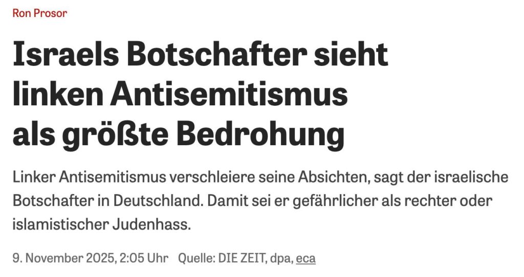 Und was sagt der israelische Botschafter am 9. November, dem Jahrestag der Reichspogromnacht? Der „linke Antisemitismus“ sei „gefährlicher als der von rechts und von Islamisten“. Alles klar.