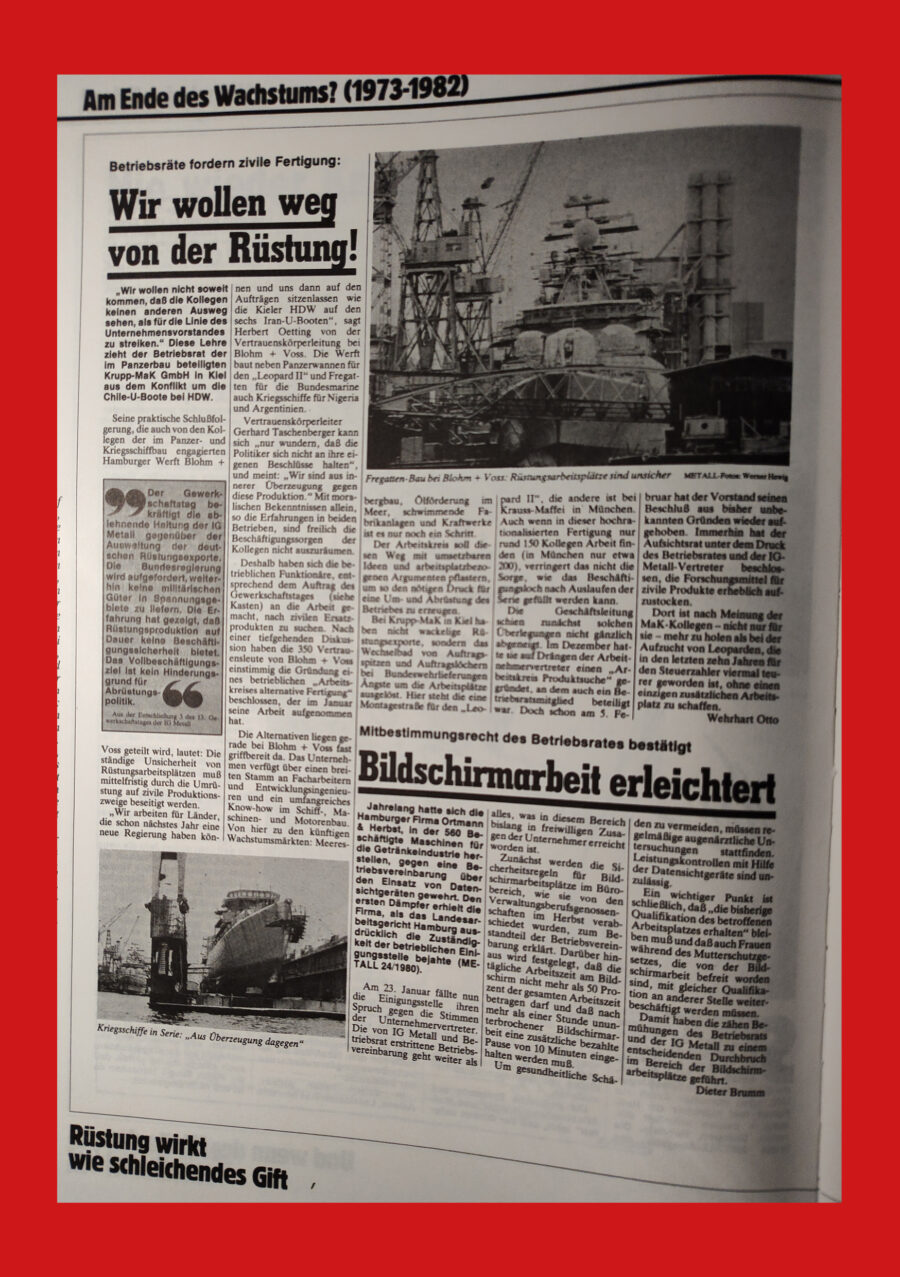 Doch ausgerechnet die zentrale Frage – die Kriegsertüchtigung und Militarisierung der Industrie – bleibt ausgeklammert. Statt dessen schiebt die Führung die Debatte um eine »Übergewinnsteuer« vor. Anstatt ihre reale Organisationsmacht und das enorme Spezialistenwissen der Mitglieder und Betriebsräte zu nutzen, beschränkt sich die IG-Metall-Führung aktuell noch darauf, die Militarisierung zu verwalten. Kerner sprach auf der Handelsblatt-Tagung »Wirtschaftsfaktor Rüstung« – ausgerechnet am 1. September, dem Antikriegstag! – über Zertifizierungsverfahren, die Unternehmen beim Einstieg in die Waffenproduktion zu beachten hätten. Nicht die Frage »Wie stoppen wir diese Entwicklung?« sondern »Wie begleiten wir sie?« stand im Zentrum. Diese Haltung markiert einen Rückschritt hinter die eigene Geschichte. In den 1980er Jahren formulierte die IG Metall klare Positionen gegen die Militarisierung. Noch bis in die frühen 2000er Jahre hinein war die Orientierung eindeutig: Rüstung schafft keine Zukunft, Konversion ist notwendig.