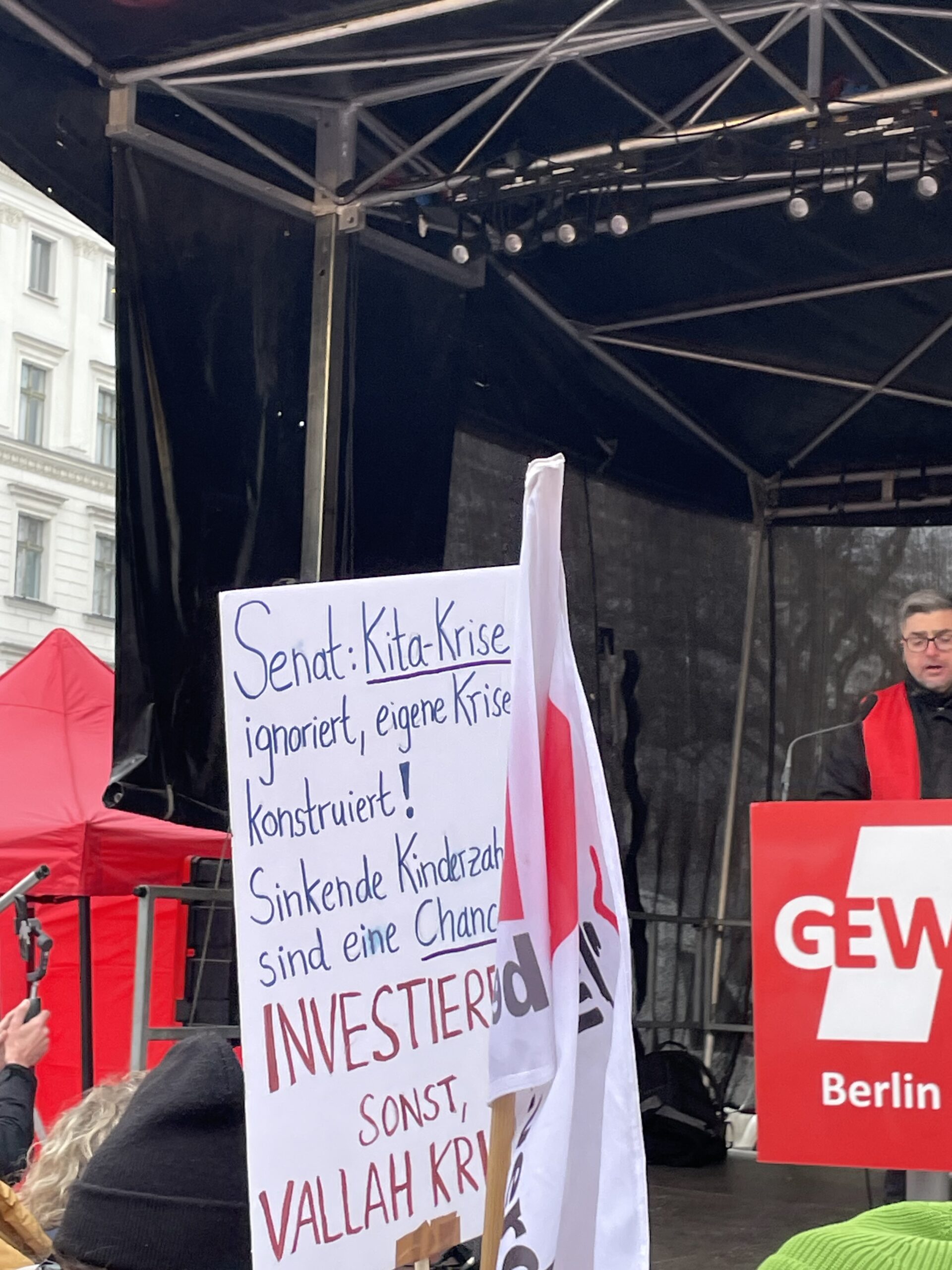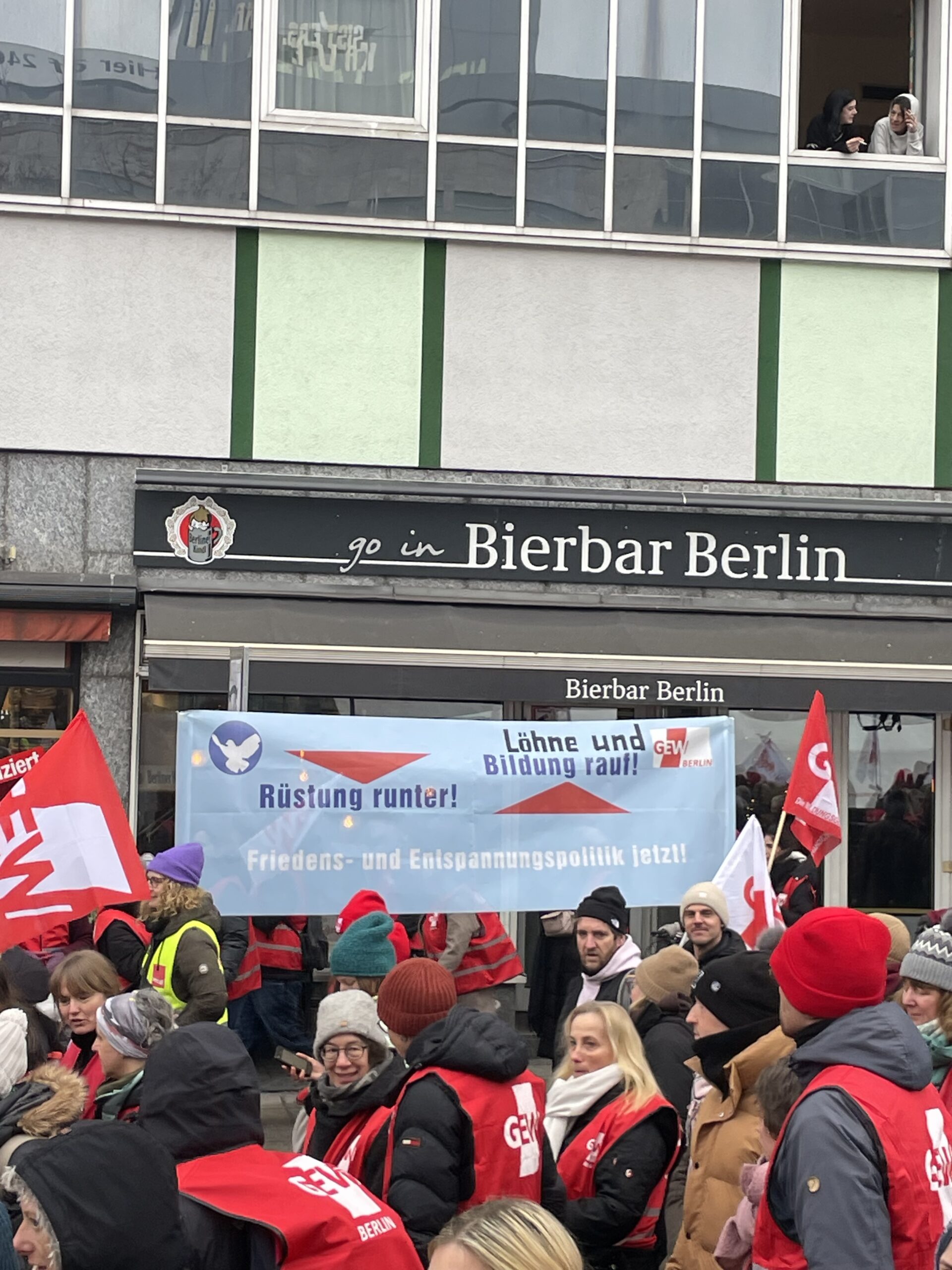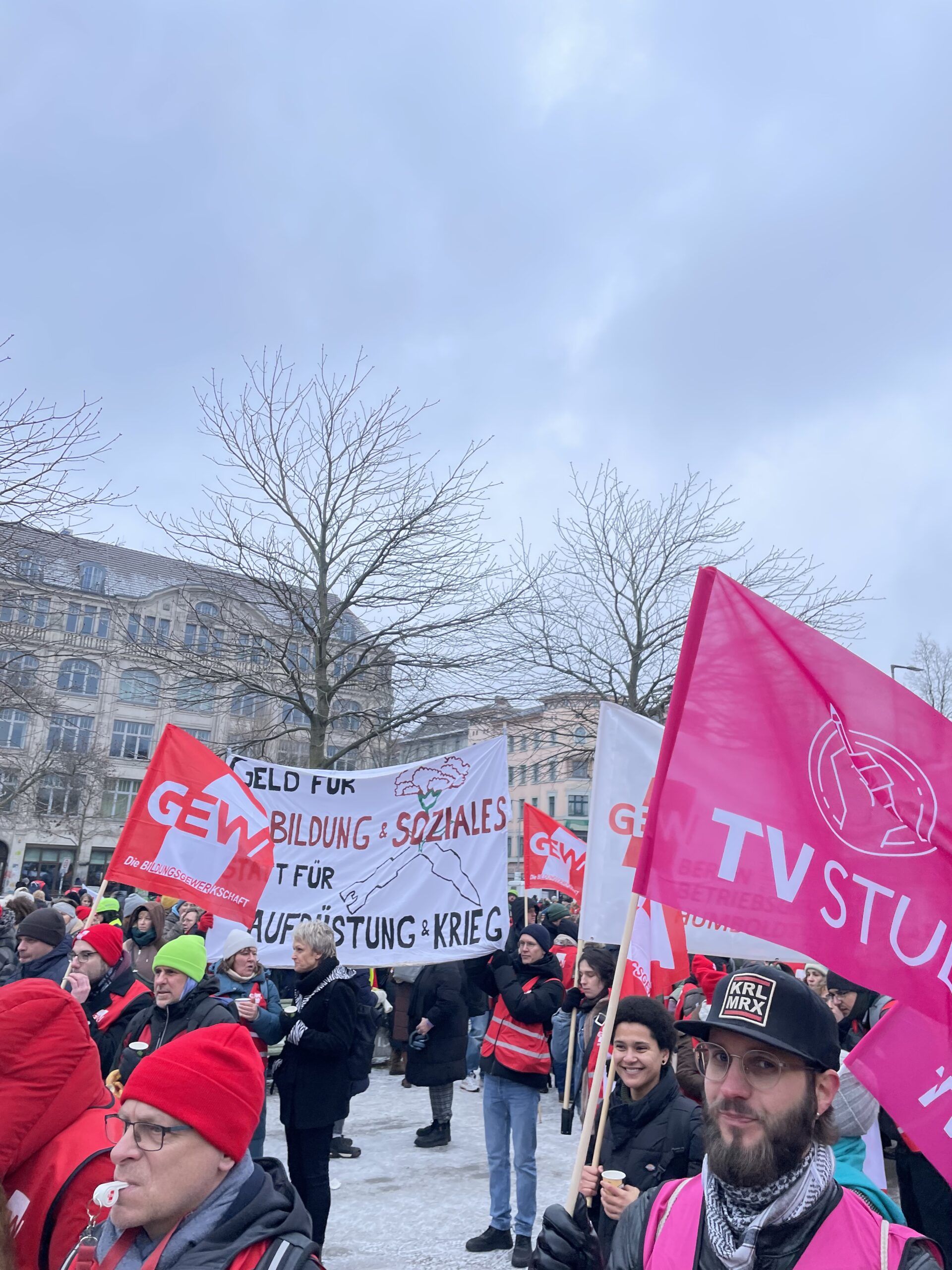 Gewerkschafter:innen fragen sich schon länger, warum große Teile der Gewerkschaftsführungen unter diesen Voraussetzungen eigentlich nicht müde werden eine angeblich vorhandene „Sozialpartnerschaft“ zu betonen. Der Ansicht vieler nach, sollten Gewerkschaften nicht länger davor zurückschrecken die Tarifrunden in den politischen Zusammenhang zu stellen, in dem sie ganz offensichtlich statt finden. Im Demozug und vor der Bühne zeigten Kolleg:innen mit Transparenten und Schildern auf, dass die Aufrüstungspläne der Bundesregierung zu Lasten von Bildung und sozialem Zusammenhalt geht. Viele GEW Mitglieder wünschen sich schon länger eine klare Benennung dieser Zusammenhänge durch ihre Gewerkschaftsführung. Die wagt, wie andere DGB Gewerkschaften auch, den Regierungskurs an dieser entscheidenden Stelle nur zaghaft zu kritisieren.