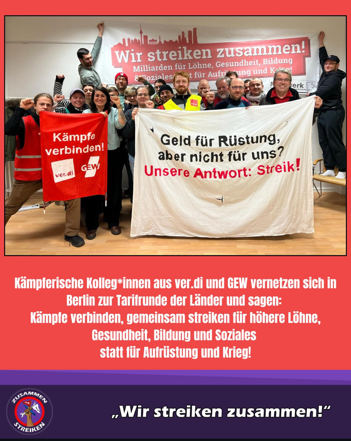 Der DGB muss nun endlich Proteste gegen Militarisierung und Kürzungspolitik organisieren. Außerdem muss die volle Kampfkraft in die Waagschale geworfen werden. Die Streikenden müssen endlich demokratisch an Entscheidungen zur Streikstrategie beteiligt werden. Viele Kolleg:innen können nicht nachvollziehen, weshalb Ver.di und GEW nicht dazu in der Lage sind, sich besser abzusprechen und gemeinsam auf die Straßen zu mobilisieren. Branchenstreikwochen erhöhen eventuell kurzfristig die Sichtbarkeit für eine Branche, doch für eine kraftvolle Streikbewegung braucht es endlich echte Beteiligung und Vernetzung. Wir Beschäftigte wollen selbst entscheiden, wie wir den nötigen Druck auf die Gegenseite aufbauen können. Viele haben über die Jahre den Eindruck gewonnen, dass die Gewerkschaftsbürokratie die Streikbeteiligung so regulieren möchte, dass sie die Kolleg:innen jederzeit mit einem „guten Kompromiss in schwierigen Zeiten“ abspeisen kann und so als verlässliche Sozialpartnerin wahr genommen wird. Das ist jedoch nicht in unserem Interesse. Die Apparate sollten für uns arbeiten, nicht wir für sie.