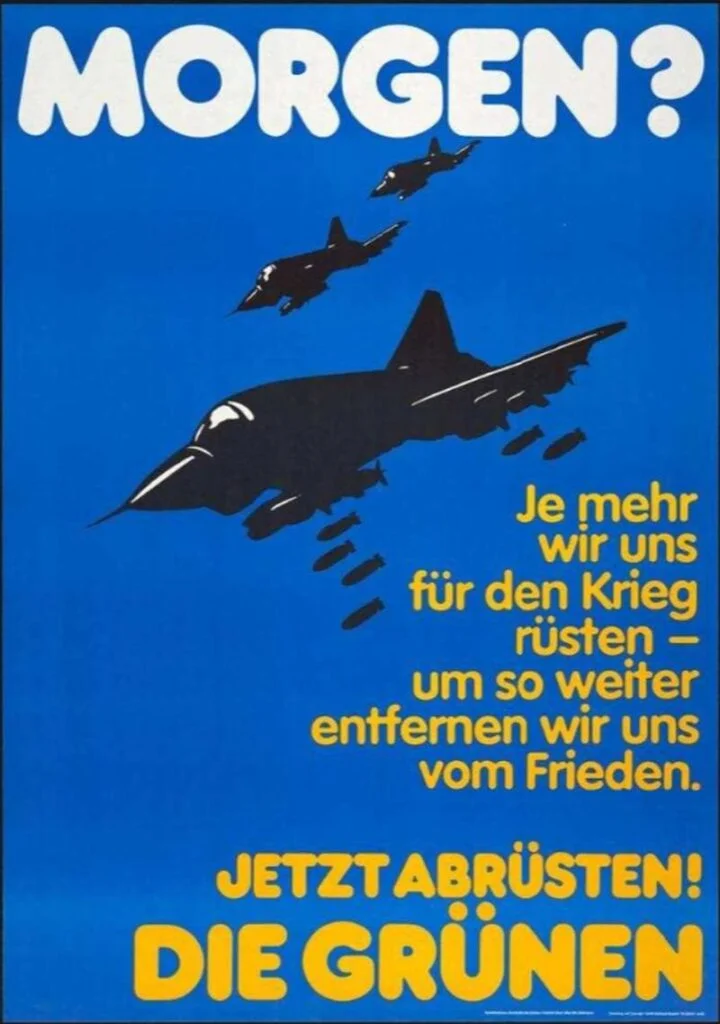 Damals waren noch Töne von den Grünen zu hören, wegen denen sie heute fleißig bei allen Repressionsorganen des Staats rapportieren würden. „Jetzt erst recht: Fahnenflucht – Sagt Nein! Verfügbarkeit als Soldaten für diese Planungen ist ein wesentlicher Faktor ihrer Durchführbarkeit; Widerstand, politischer Protest und Verweigerungen aus den Reihen der Armee selber mithin ein ernsthafter Störfaktor für die Planer im Kabinett, und Hardt-Höhe bzw. in den Nato-Headquarters. Wir rufen Euch ganz besonders auf. Verweigert Euch diesen Planungen! Verweigert den Kriegsdienst, verlasst die Armee.“