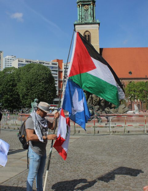 Zwischen dem Mittelmeer und dem Jordanfluss sind zudem heute Millionen Menschen in den vom israelischen Millitär beherrschten Gebieten militanten Siedlerbanden, einer vom Militär kontrollierten Willkürjustiz und einer israelischen Militärverwaltung täglich ausgesetzt. Weltweit solidarisieren sich Menschen gegen die seit über ein halbes Jahrhundert bestehende völkerrechtswidrige Militärbesatzung und fordern eine sofortige Beendigung dieses Regimes. Was kann dies konkret bedeuten?“
