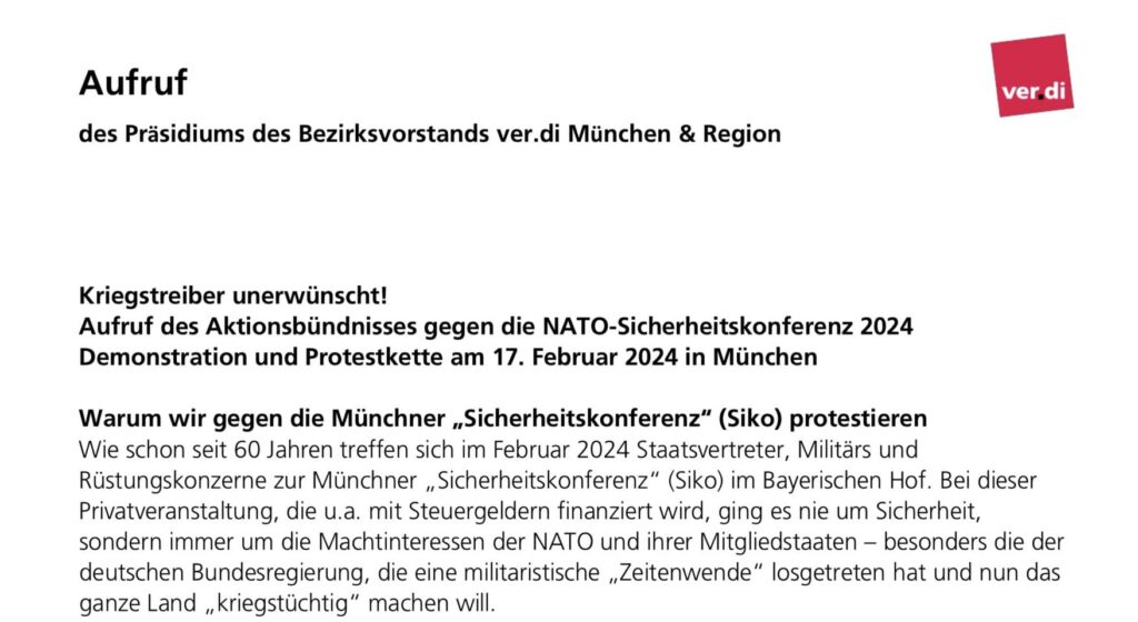 Komm nach München am 17.2.2024 , mach mit . Werde Friedensaktivist. Hier kannst Du den Aufruf unterzeichnen oder wie zum Beispiel ver.di München verbreiten!