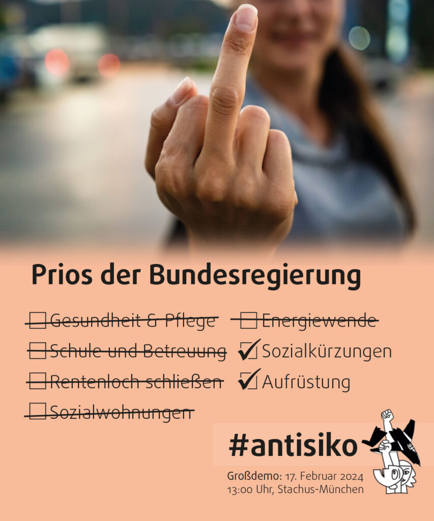 Den Organisatoren der Siko gehen die „immer noch unzureichende[n] neue[n] Verteidigungsausgaben“ nicht weit genug.14 Wir protestieren gegen diese beispiellose Geldverschwendung angesichts der sozialen Missstände in Deutschland und auf der ganzen Welt!15
