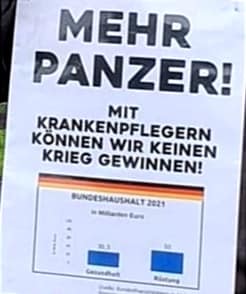 - Steuergelder für Sozialsysteme, Gesundheits- und Bildungswesen, Klima-, Arten- und Umweltschutz, ÖPNV, Flüchtlings- und Welthungerhilfe statt für Panzer und Bomben!