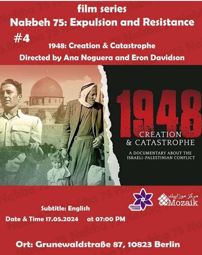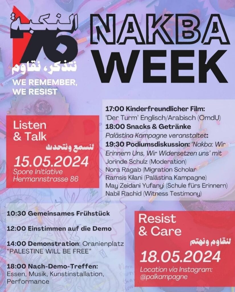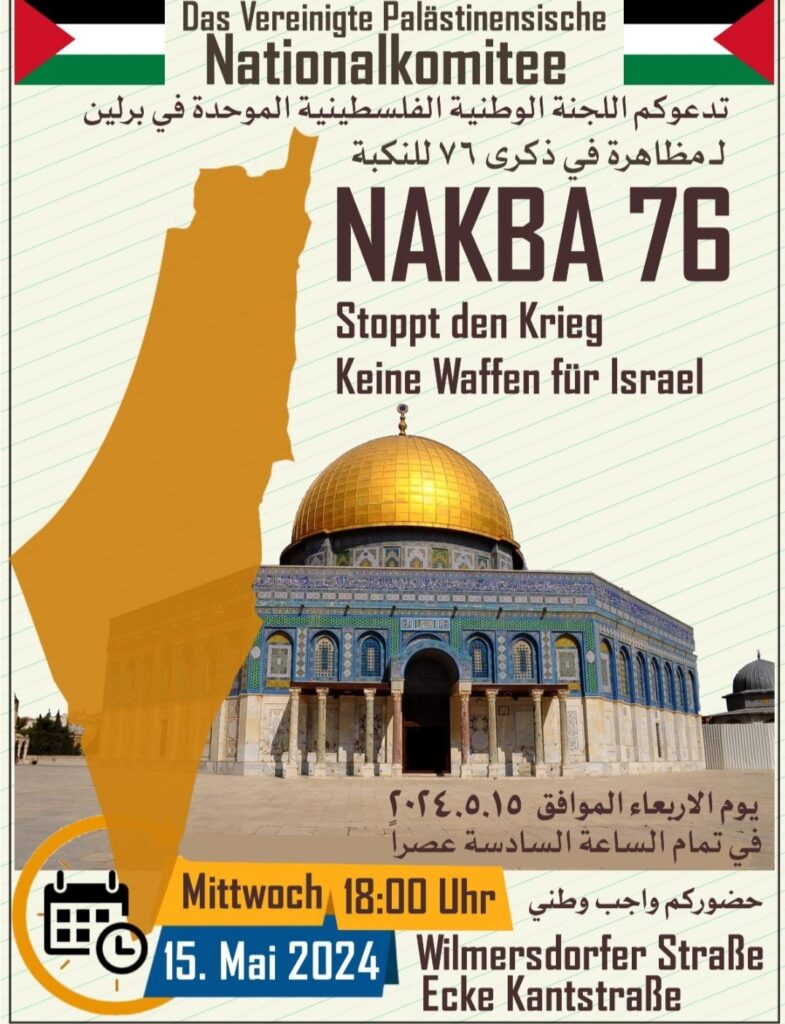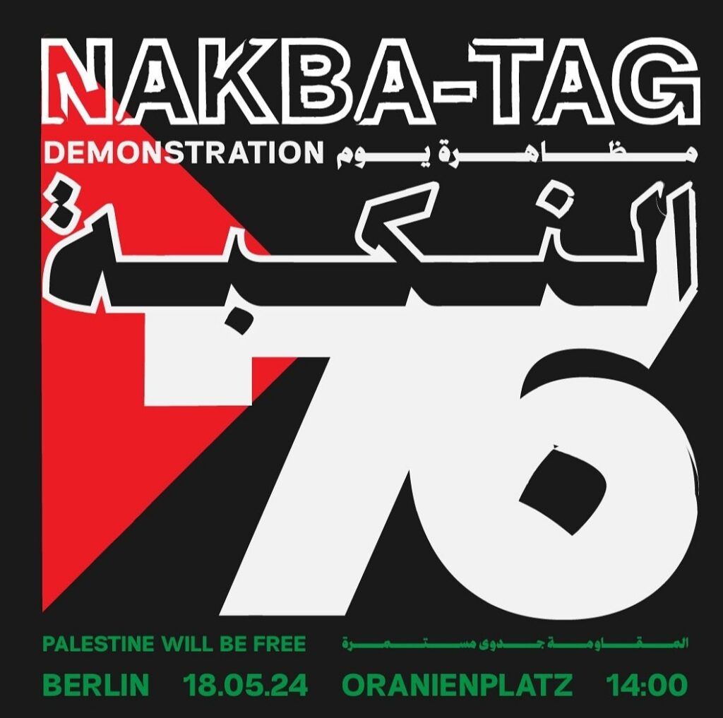 Demonstrationen und Veranstaltungen zum palästinensischen Nakba, dem Gedenktag ihrer Vertreibung. Dieses Jahr vor dem Hintergrund des mutmaßlichen Genozids in GAZA und eskalierender rassistischer Gewalt und Unterdrückung im Westjordanland und in Israel selber. Nicht Weggucken. Nicht vergessen. Auch wenn hierzulande versucht wird, jeden Protest zu diffamieren und zu unterdrücken!