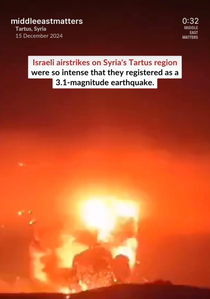 „Die israelische Armee griff in der Nacht zum Montag syrische Militärstandorte in der Küstenregion Tartus an. Die heftigen Detonationen nach den Bombardierungen lösten Signale von Erdbebensensoren aus, so mehrere Kriegsbeobachtungsgruppen in der Region. Dabei wurden Werte bis zu einer Stärke von 3,1 auf der Richterskala gemessen.